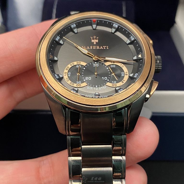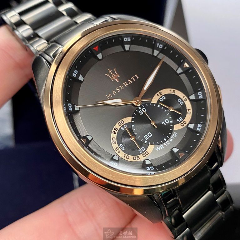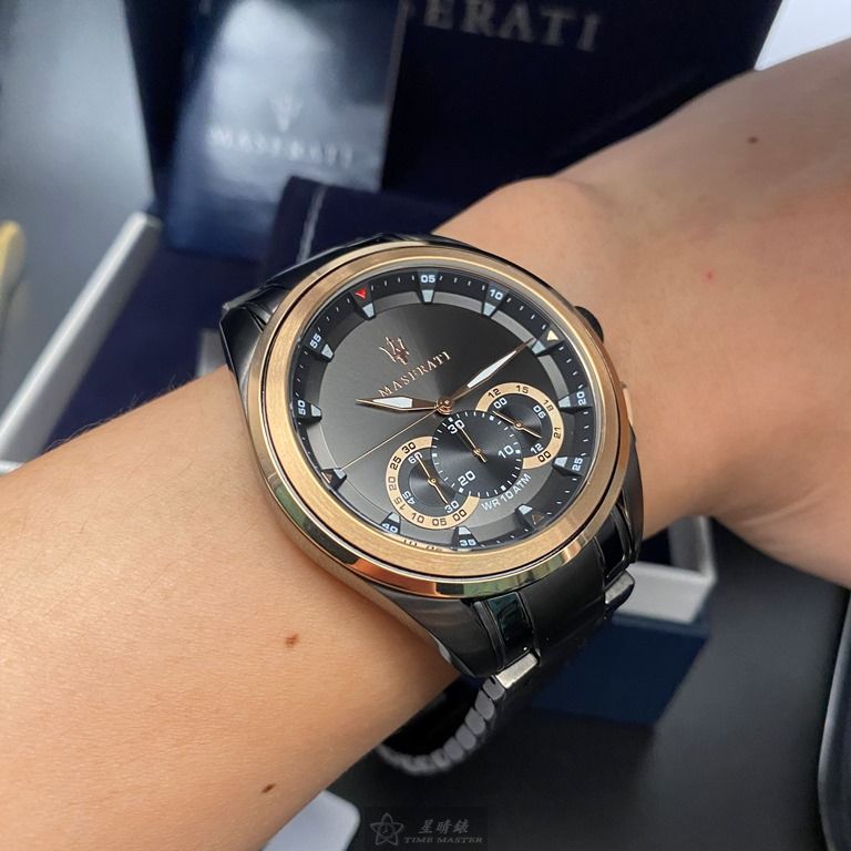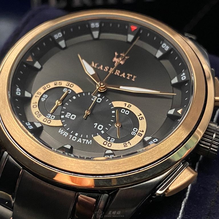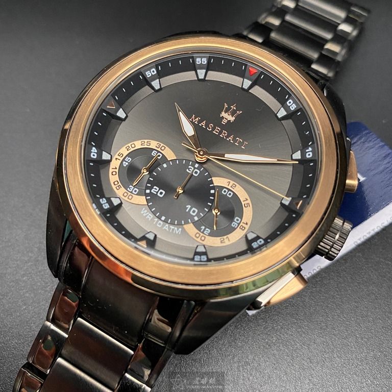 MASERATI手錶,編號R8873612016,46mm黑圓形精鋼錶殼,黑玫瑰金色三眼, 運動錶面,深黑色精鋼錶帶款
