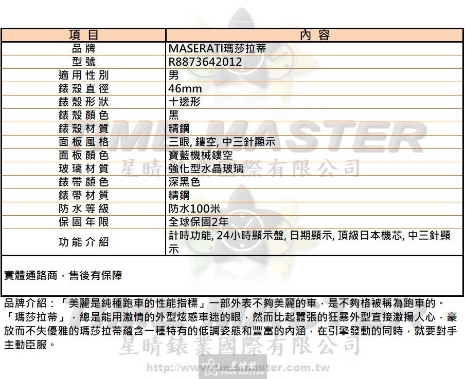 MASERATI手錶,編號R8873642012,46mm黑錶殼,深黑色錶帶款