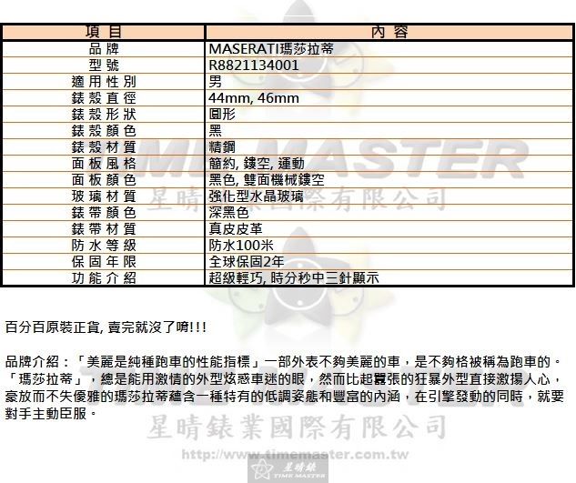 MASERATI瑪莎拉蒂男錶,編號R8821134001,44mm, 46mm黑錶殼,深黑色錶帶款