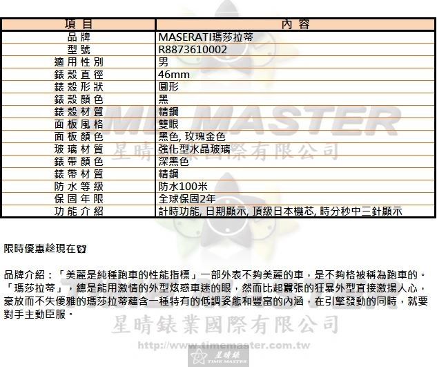 MASERATI瑪莎拉蒂男錶,編號R8873610002,46mm黑錶殼,深黑色錶帶款