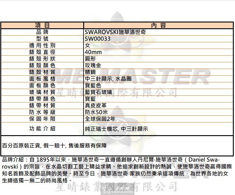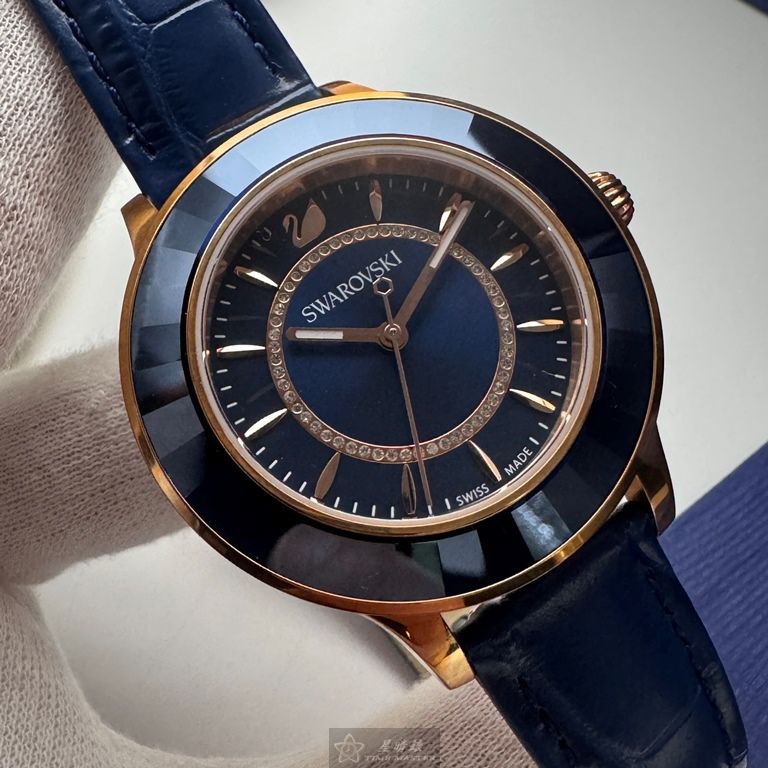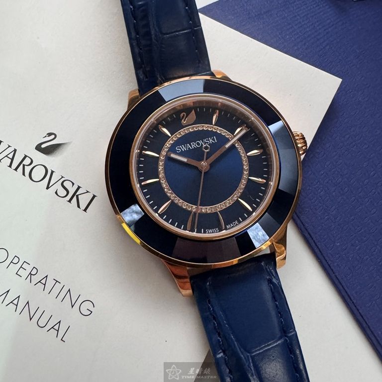 SWAROVSKI手錶,編號SW00033,40mm玫瑰金錶殼,寶藍錶帶款
