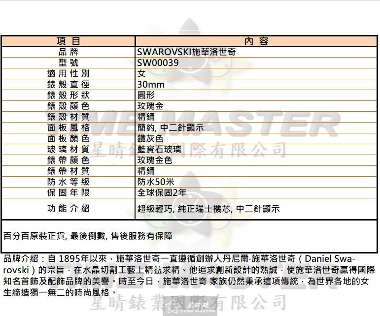 星晴錶業以務實態度推出SWAROVSKI SW00039女錶,雖非市場上最奢華的選擇,但以可靠品質為核心而設計。 這款腕錶以30mm圓形玫瑰金精鋼錶殼呈現低調質感,肩負著為日常佩戴提供穩定可信的使命。 鐵灰色簡約面盤搭配中二針顯示,沒有浮誇細節,但帶來清楚易讀的視覺體驗。 搭載瑞士石英機芯,雖然不追求複雜結構,卻堅持以穩定走時作為基本承諾。 藍寶石玻璃鏡面提供耐刮保護,務實地確保商品在長期使用下仍能維持良好外觀。 玫瑰金精鋼錶帶不以華麗取勝,而是以耐用、舒適與一致的色調提升整體質感。 防水50米的設計雖非專業級規格,但足以應付日常生活的意外接觸水分。 全球2年保固展現品牌對產品品質的負責態度,提供消費者基本而安心的保障。 重量輕巧、佩戴舒適,使這款腕錶在日常使用中展現腳踏實地的價值。 整體而言,SW00039的價格或許不是最低,但以其精鋼材質、瑞士機芯與耐用結構,提供一款誠實可靠、值得信賴的優質選擇。