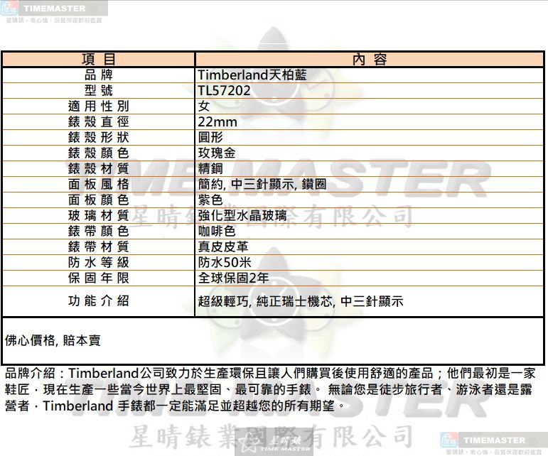 在尋找一款兼具質感與實用性的Timberland天柏藍女錶時,TL57202以22mm玫瑰金圓形精鋼錶殼與紫色面盤設計,低調呈現女性細膩氣質。 這不是市場上最華麗的女錶,但純正瑞士石英機芯與中三針顯示帶來穩定準確的日常走時,讓時間回歸單純而可靠的本質。 玫瑰金錶殼搭配鑽圈細節與簡約紫色面板,讓這款Timberland天柏藍女錶在正式與休閒穿搭之間取得平衡。 強化型水晶玻璃提升耐用度,防水50米的實用規格,讓TL57202成為日常通勤與約會都安心佩戴的選擇。 咖啡色真皮皮革錶帶貼合手腕,質地溫潤,長時間配戴依然舒適輕巧,呈現女性腕錶應有的細緻比例。 我們明白它的價格並非市場上最便宜,但精鋼材質、瑞士機芯與全球保固2年,是對品質負責的基本承諾。 星晴錶業肩負推廣正規授權Timberland天柏藍女錶的使命,讓每一位選擇TL57202的顧客,都能安心擁有穩定與保障。 22mm小巧錶徑設計特別適合喜歡低調優雅風格的女性,讓腕間比例更協調,也更容易融入各種穿搭場合。 如果妳在比較石英女錶推薦清單時,希望找到一款品質精良、設計耐看且不浮誇的款式,TL57202會是一個務實而安心的選擇。 選擇Timberland天柏藍TL57202女錶,不是追求最便宜的標籤,而是為自己挑選一只真正耐用、實戴且值得長期陪伴的腕錶。