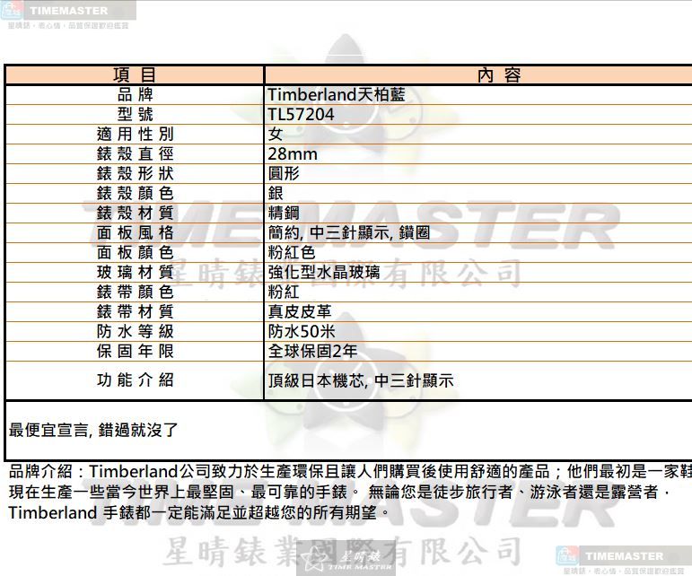 星晴錶業嚴選【Timberland天柏藍 TL57204 女錶】,以28mm圓形精鋼錶殼搭配粉紅面盤,為日常穿搭帶來剛剛好的細膩存在感。 這不是市場上最昂貴的精品女錶,但我們肩負把關品質的責任,選擇頂級日本石英機芯,讓每一次走時都穩定可靠。 粉紅色面板結合中三針顯示與鑽圈設計,簡約中帶有柔和光澤,適合尋找優雅氣質女錶推薦的妳。 精鋼銀色錶殼搭配強化型水晶玻璃,在日常使用中提供扎實保護,讓這款Timberland女錶更耐看也更耐用。 真皮粉紅錶帶貼合手腕,觸感柔軟卻不失支撐力,為講究細節的女性打造實戴型石英女錶選擇。 防水50米設計足以應付洗手與日常生活需求,這是一只務實設定的品牌女錶,而非華而不實的裝飾品。 價格或許不是市面上最便宜的女用手錶,但在精鋼材質、真皮錶帶與全球保固2年的基礎上,我們更在意的是長期陪伴的價值。 全球保固兩年由星晴錶業提供完整服務,讓每一位選擇Timberland天柏藍女錶的顧客都能安心配戴。 28mm圓形設計適合多數女性手腕比例,無論上班穿搭或假日約會,都能自然融入日常風格。 如果妳正在尋找一款品質精良、設計簡約、價格合理的Timberland TL57204 女錶,這是一份我們認真挑選、值得交付時間的選擇。