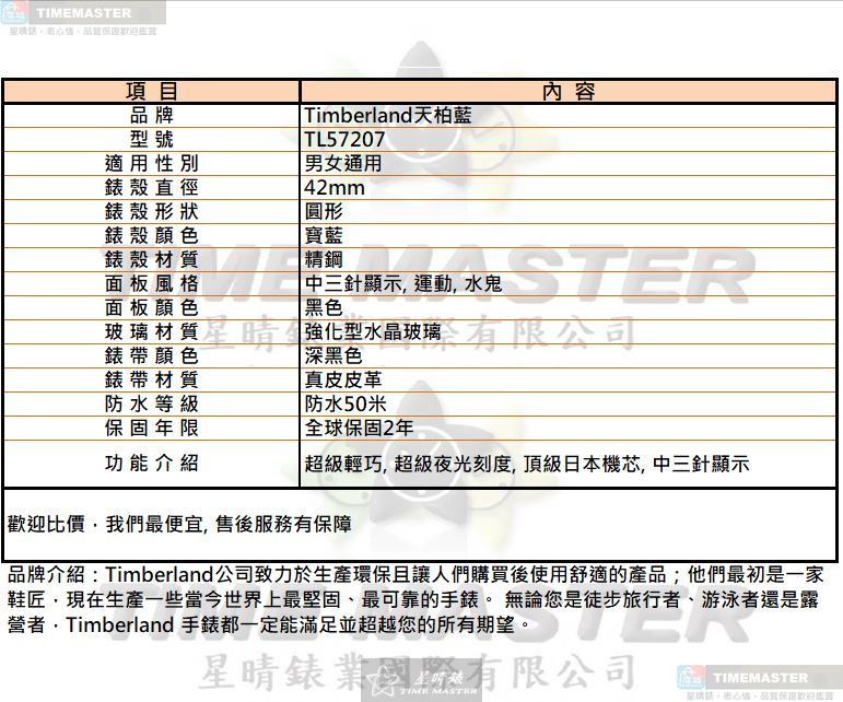 Timberland手錶,編號TL57207,42mm寶藍錶殼,深黑色錶帶款