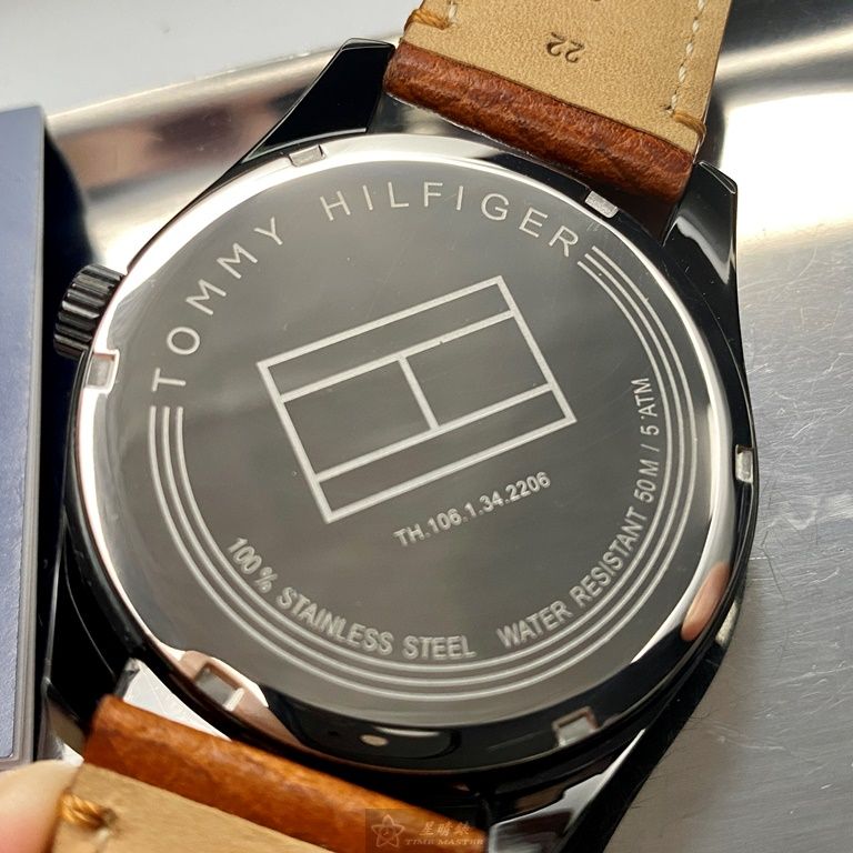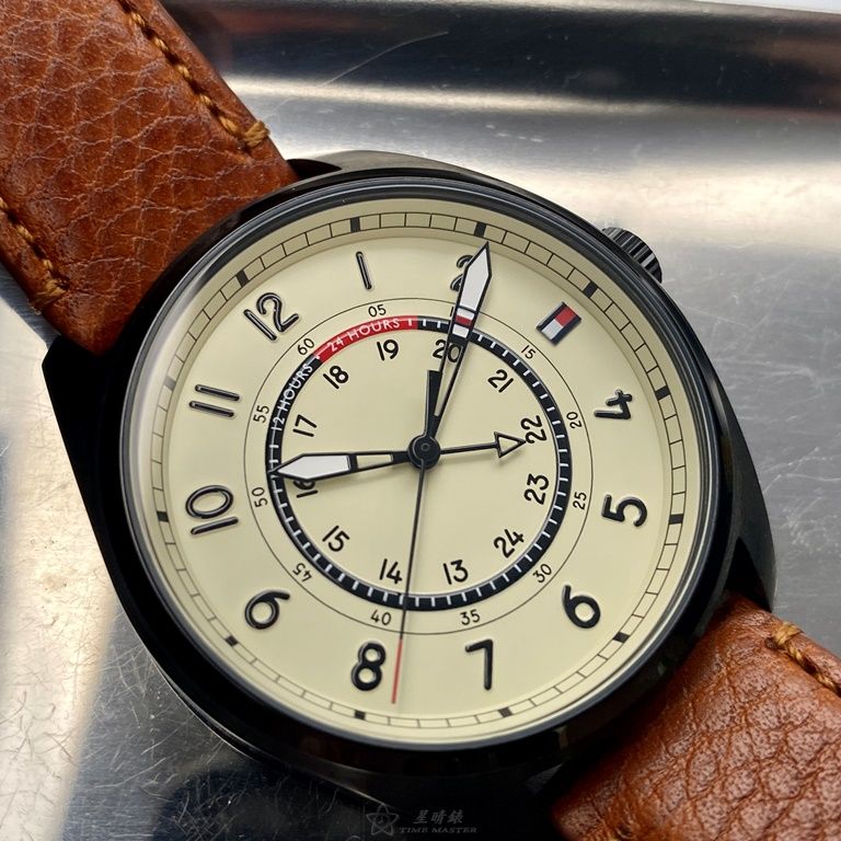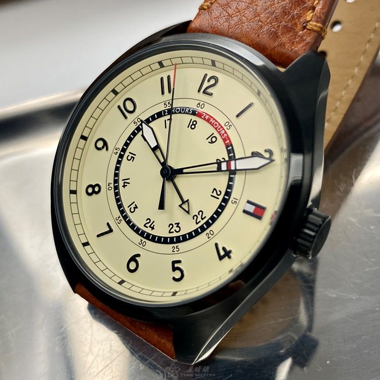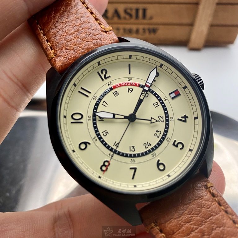 TommyHilfiger手錶,編號TH00033,44mm黑圓形精鋼錶殼,米黃色精密刻度錶面,咖啡色真皮皮革錶帶款