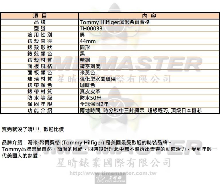 星晴錶業推出Tommy Hilfiger湯米希爾費格TH00033男錶,精鋼圓形錶殼搭配米黃色精密刻度面板,展現低調的品味。 錶徑44mm設計適合大多數男士手腕,厚實而不笨重,佩戴感舒適,適合日常與正式場合。 採用頂級日本石英機芯,精準可靠,讓你掌握時間從容不迫,即便不是最昂貴的選擇,也值得信賴。 咖啡色真皮錶帶柔軟貼合,散發沉穩氣質,兼具耐用性與舒適感,適合肩負工作與生活重任的你。 強化型水晶玻璃面板防刮耐磨,保護內部機芯不受日常磨損,細節中體現品質用心。 防水50米設計,無論日常洗手或小雨,都能安心佩戴,為生活增添便利而不誇張。 兩地時間功能讓商務差旅或國際往返更輕鬆,細膩務實的功能設計,符合現代男性的需求。 超輕巧錶身設計,長時間佩戴也不負擔,展現對日常細節的周到考量。 全球保固2年保障,讓你無後顧之憂,即使價格不是最低,但品質與服務兼具,值得投資。 TH00033不只是計時工具,更是肩負使命的象徵,低調中展現自信與責任感,陪伴每個重要時刻。