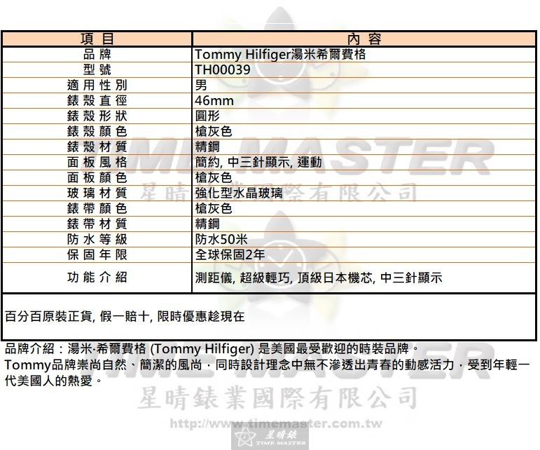TommyHilfiger手錶,編號TH00039,46mm槍灰色錶殼,槍灰色錶帶款