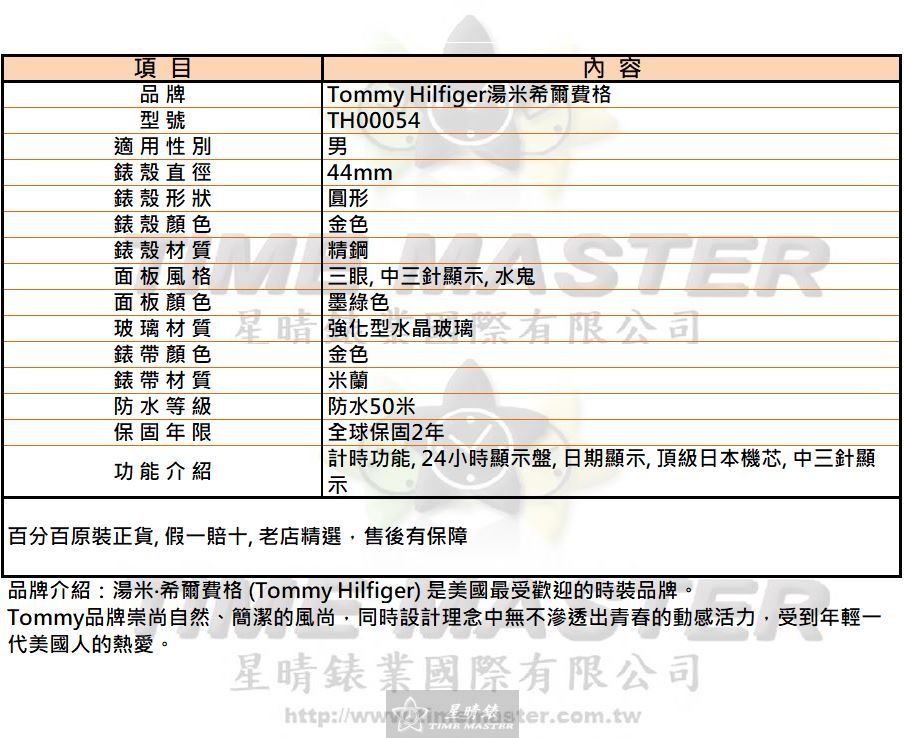 TommyHilfiger手錶,編號TH00054,44mm金色錶殼,金色錶帶款