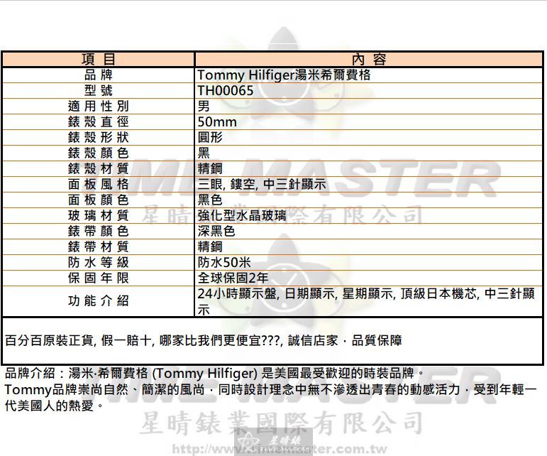 TommyHilfiger手錶,編號TH00065,50mm黑錶殼,深黑色錶帶款
