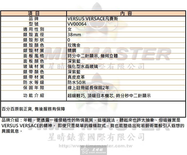 VERSUS VERSACE手錶,編號VV00064,38mm玫瑰金錶殼,深紫藍錶帶款
