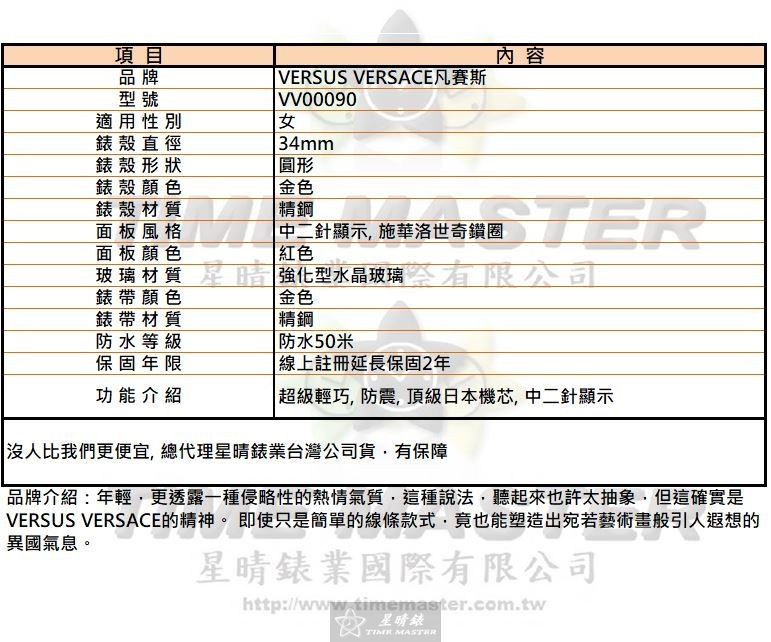 VERSUS VERSACE手錶,編號VV00090,34mm金色錶殼,金色錶帶款