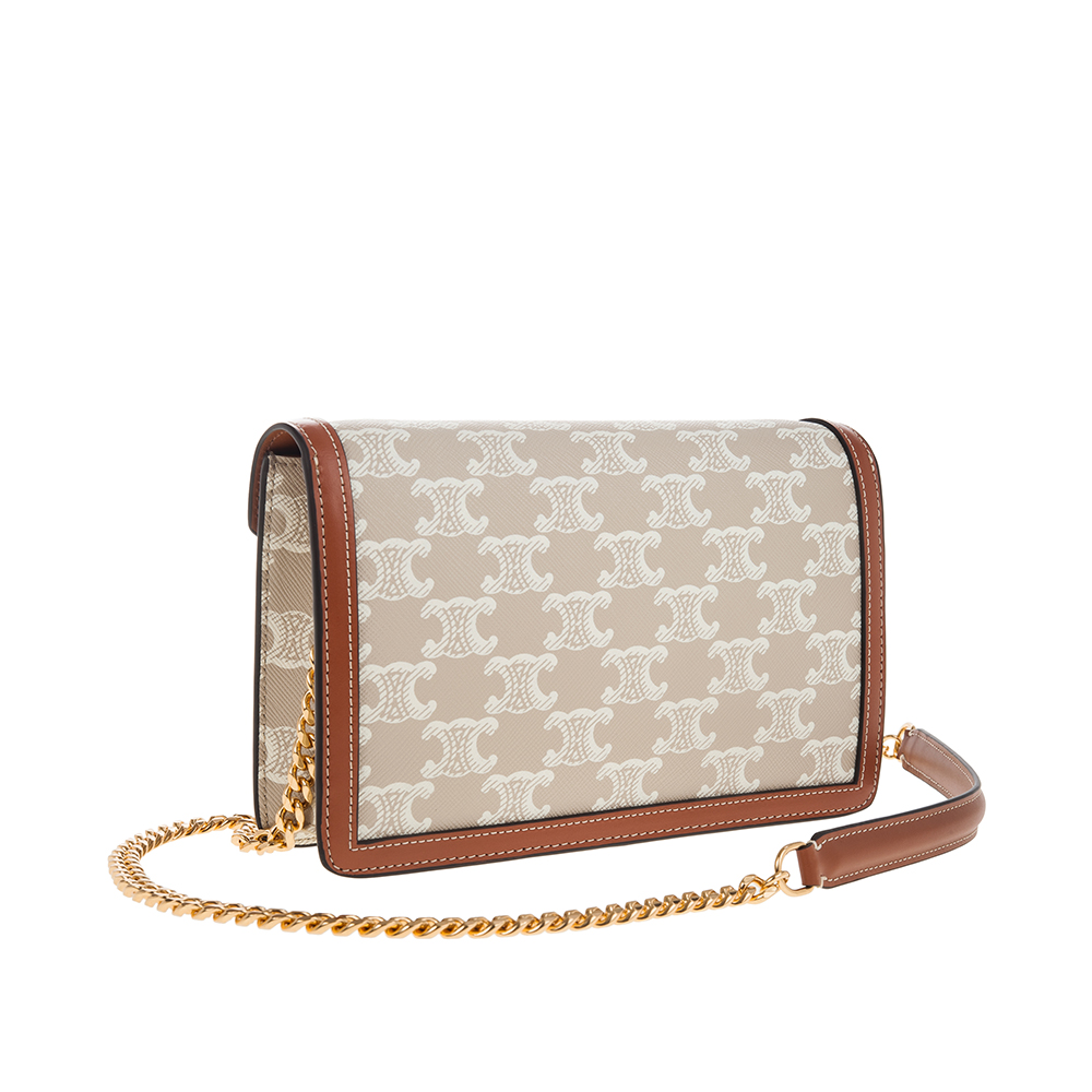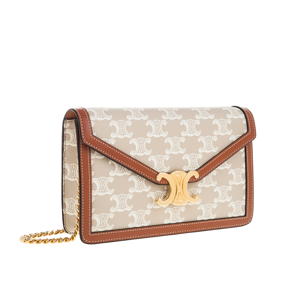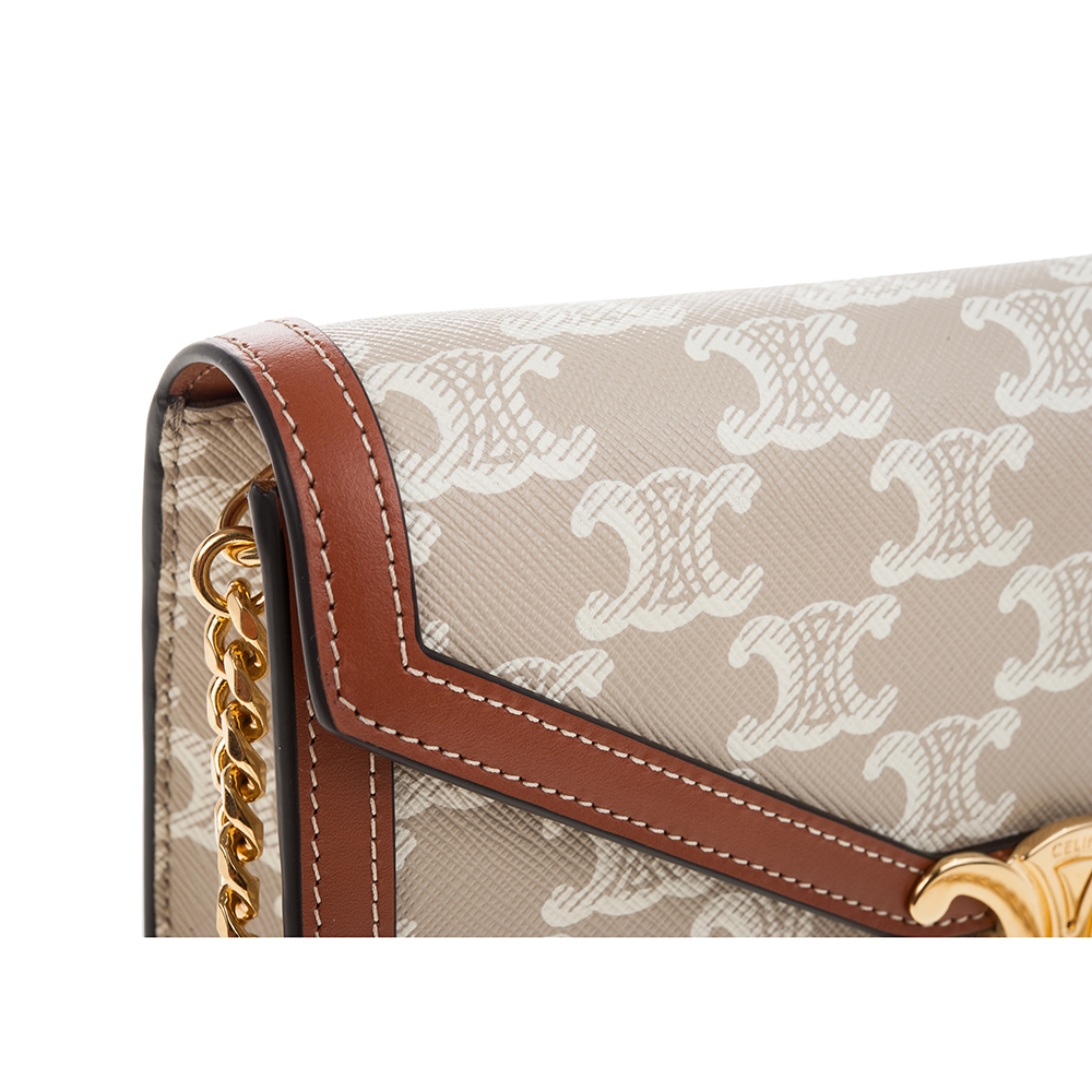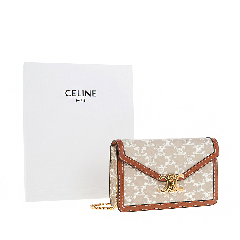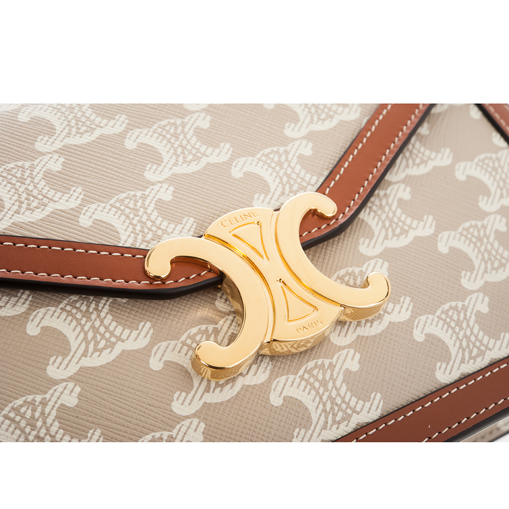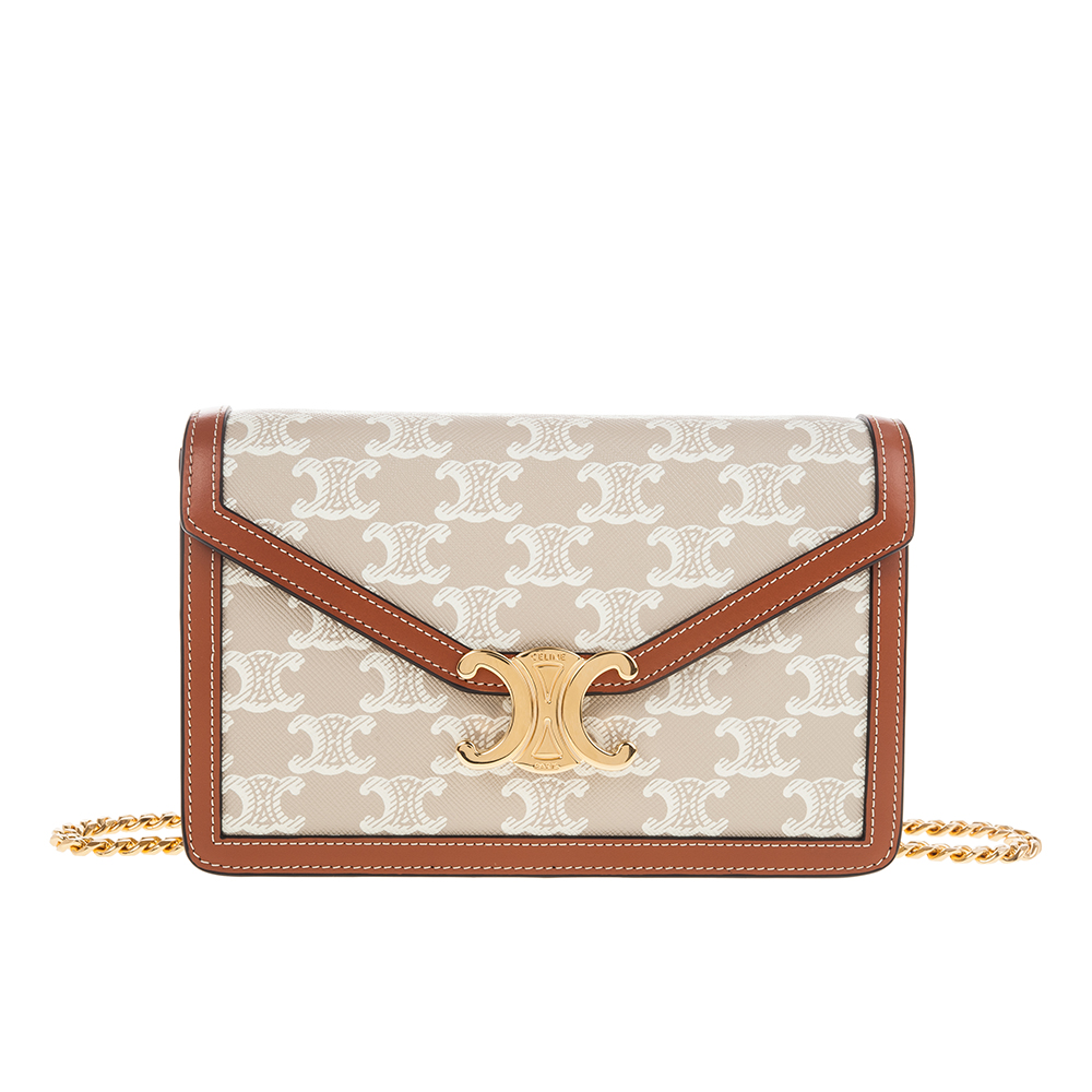CELINE 新款TRIOMPHE帆布印花牛皮革邊飾凱旋門LOGO金釦鍊帶斜背包 (米棕色)