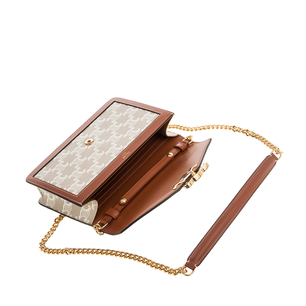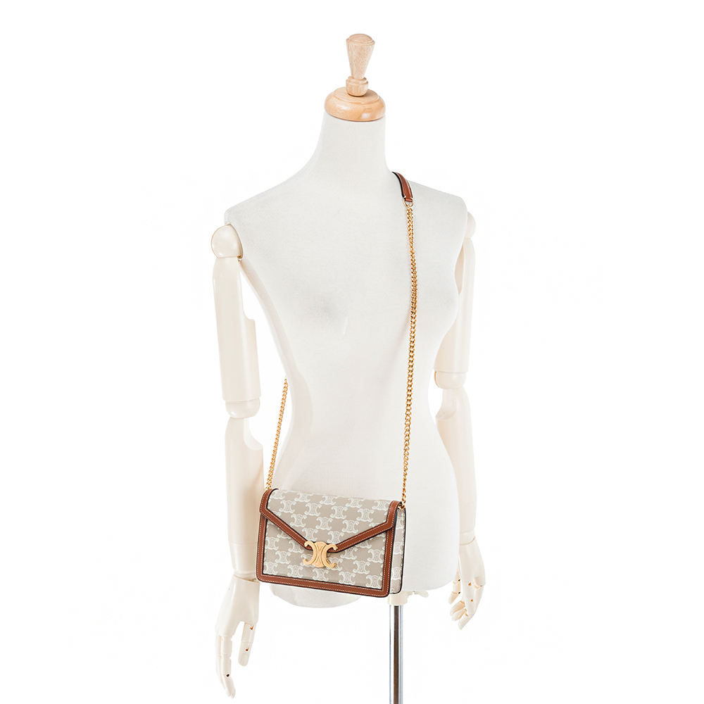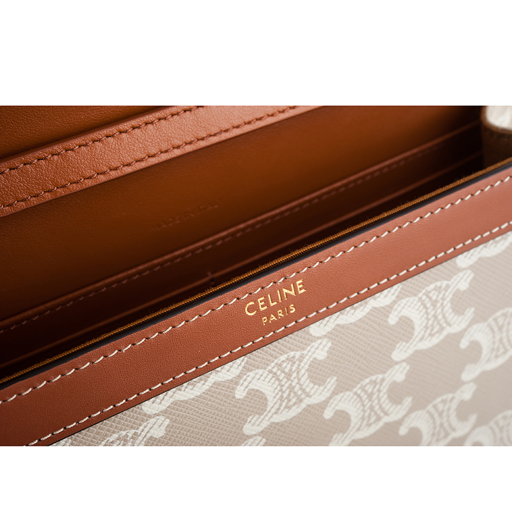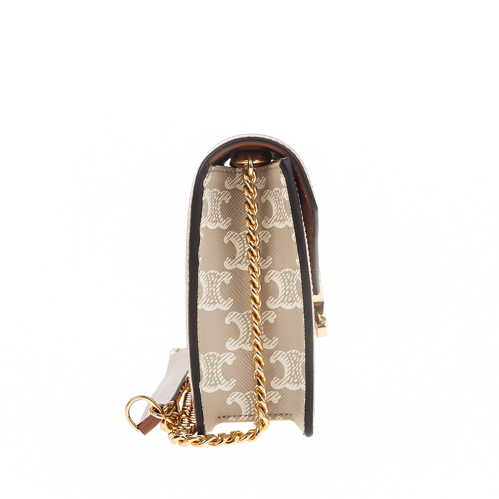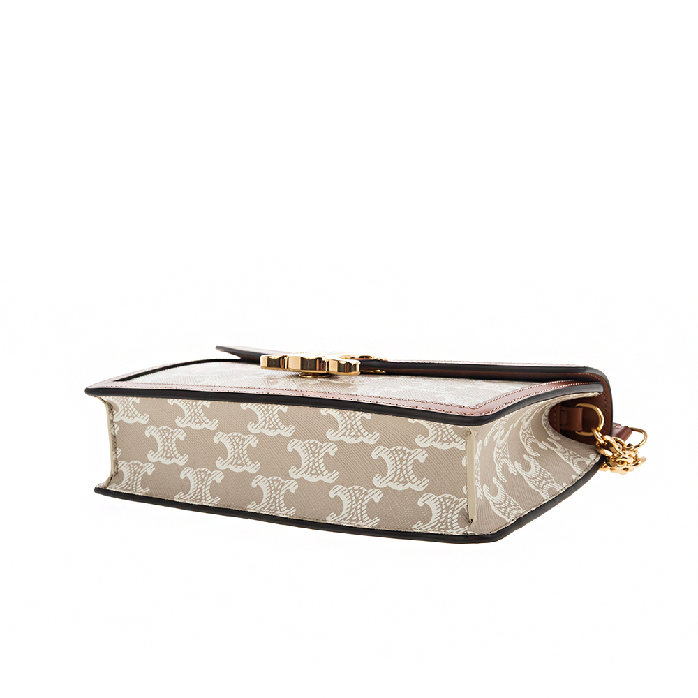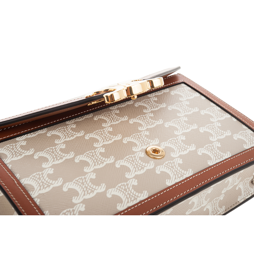 CELINE 新款TRIOMPHE帆布印花牛皮革邊飾凱旋門LOGO金釦鍊帶斜背包 (米棕色)