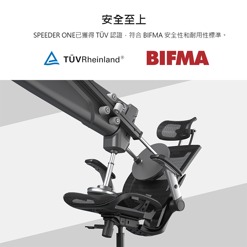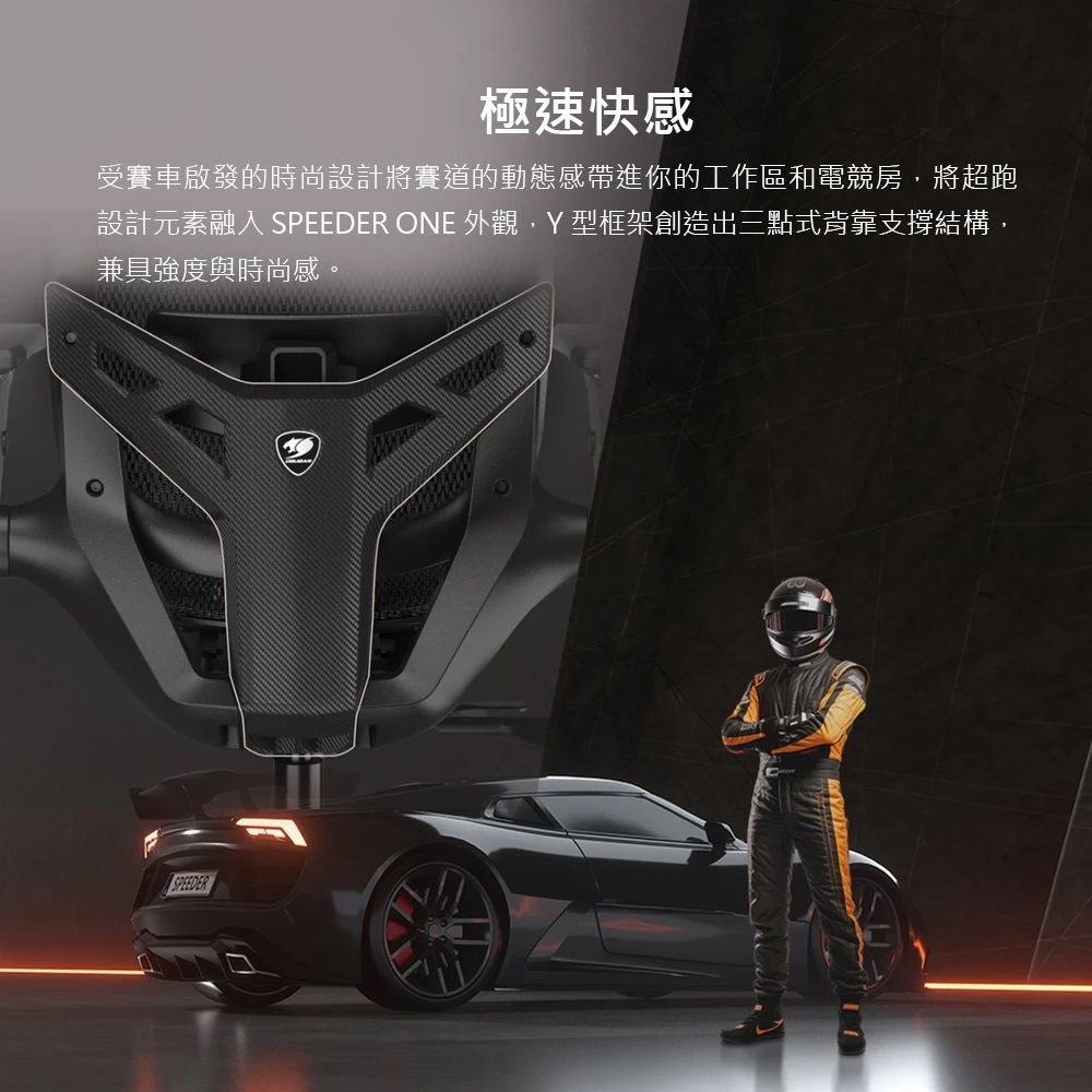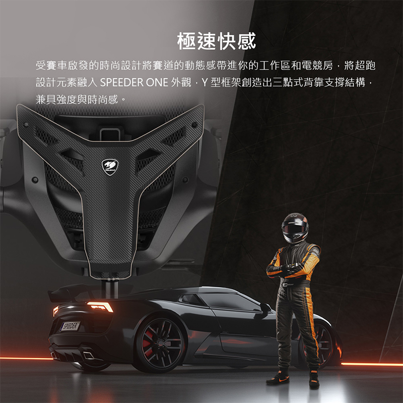 受賽車啟發的時尚設計將賽道的動態感帶進你的工作區和電競房,將超跑設計元素融入 Speeder One 外觀,Y 型框架創造出三點式背靠支撐結構,兼具強度與時尚感。