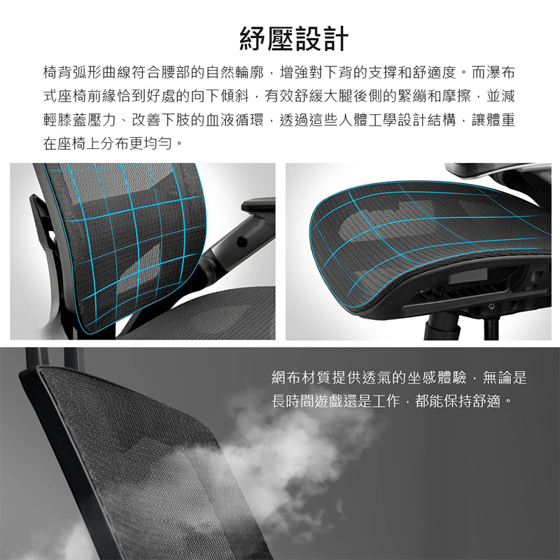 椅背弧形曲線符合腰部的自然輪廓,增強對下背的支撐和舒適度。而瀑布式座椅前緣恰到好處的向下傾斜,有效舒緩大腿後側的緊繃和摩擦,並減輕膝蓋壓力、改善下肢的血液循環,透過這些人體工學設計結構,讓體重在座椅上分布更均勻。