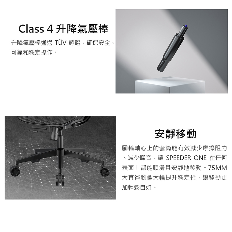 腳輪軸心上的套筒能有效減少摩擦阻力、減少噪音,讓 Speeder One 在任何表面上都能順滑且安靜地移動。75mm 大直徑腳倫大幅提升穩定性,讓移動更加輕鬆自如。