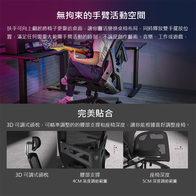 扶手可向上翻起將椅子更靠近桌面,讓你靈活變換桌椅布局,同時釋放雙手擺放位置,滿足任何需要大範圍手臂活動的時刻,不論是創作藝術、音樂、工作或遊戲,Speeder One 完全適應你的需求。