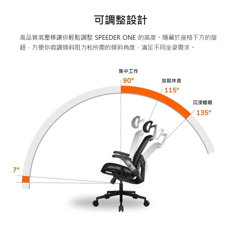現代生活中,遊戲和工作區域經常重疊,Speeder One 專為多重生活空間而設計。外觀靈感源自賽車設計,其人體工學特點幫助你在繁忙的工作時刻或激烈的遊戲中保持健康坐姿。 網布材質椅面確保透氣性,精確調整的腰靠與座椅深度讓你找到最完美的坐姿。2D摺疊扶手提供多重位置支持,無論是在辦公桌前工作還是遊戲中,手臂都不會感到疲勞。Speeder One 為身體提供最佳支撐,讓手、腦皆保持敏捷,在關鍵時刻兼具效率工作和盡情遊玩。