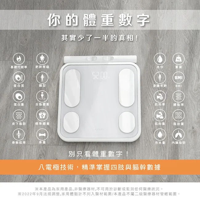內建飲食、運動菜單 八電極雙頻測量技術 58項數據加六圍紀錄