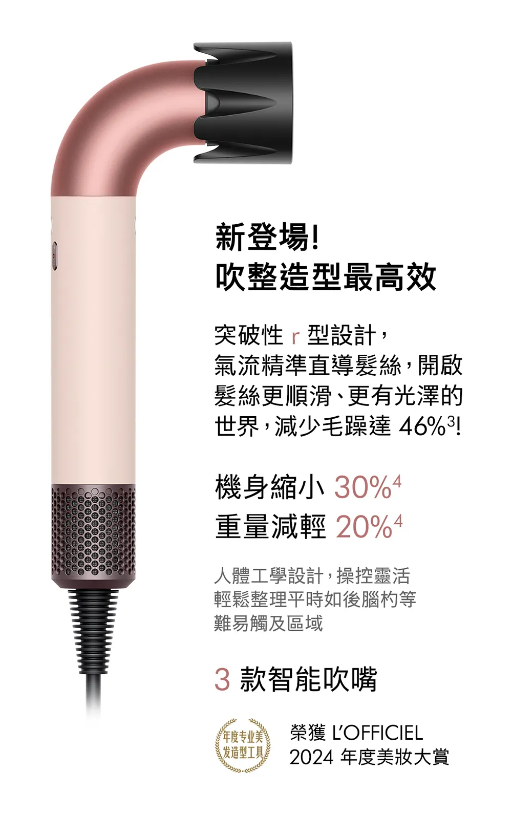 Dyson 戴森HD17 Supersonic r 精準造型 輕量吹風機 粉霧玫瑰 體積減少 30% 、重量減輕 20%,更小更輕不累手 突破人體工學r型外觀設計,快速乾髮、精準造型 3種智能配件,能記住您的造型偏好,全新升級濾網,更耐用