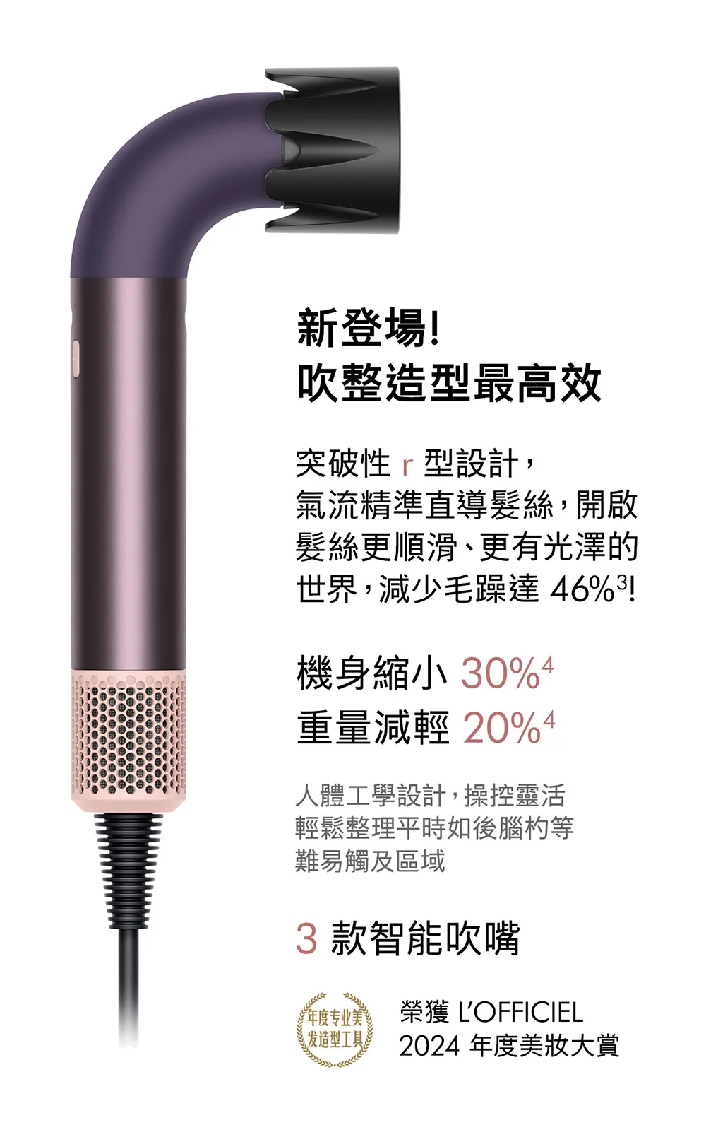 Dyson 戴森HD17 Supersonic r 精準造型 輕量吹風機 雲霧紫 體積減少 30% 、重量減輕 20%,更小更輕不累手 突破人體工學r型外觀設計,快速乾髮、精準造型 3種智能配件,能記住您的造型偏好,全新升級濾網,更耐用