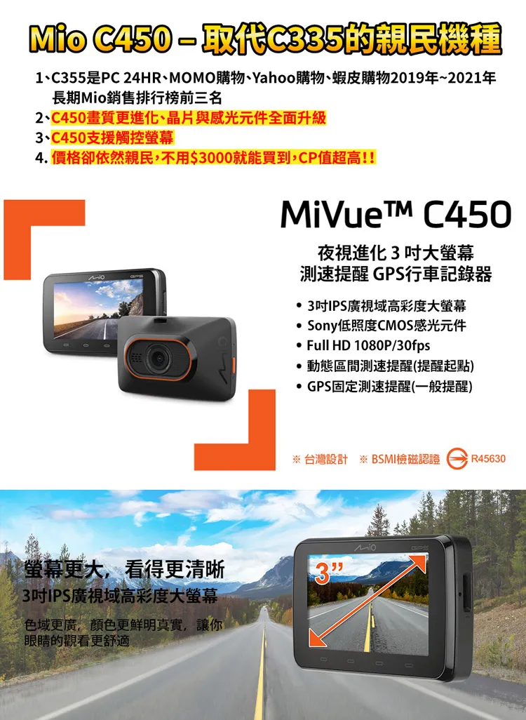 Mio MiVue C450 夜視進化 3吋大螢幕 測速提醒 GPS行車記錄器(送 32G記憶卡)
