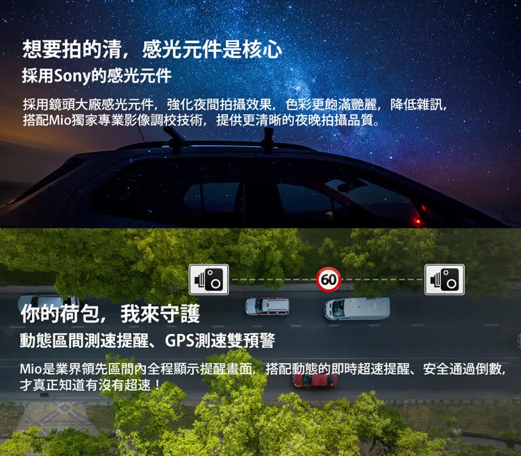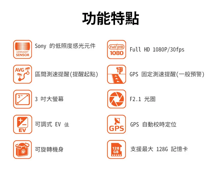 3吋IPS廣視域高彩度大螢幕 Sony低照度CMOS感光元件,Full HD 1080P/30fps 動態區間測速提醒(提醒起點),GPS固定測速提醒(一般提醒)