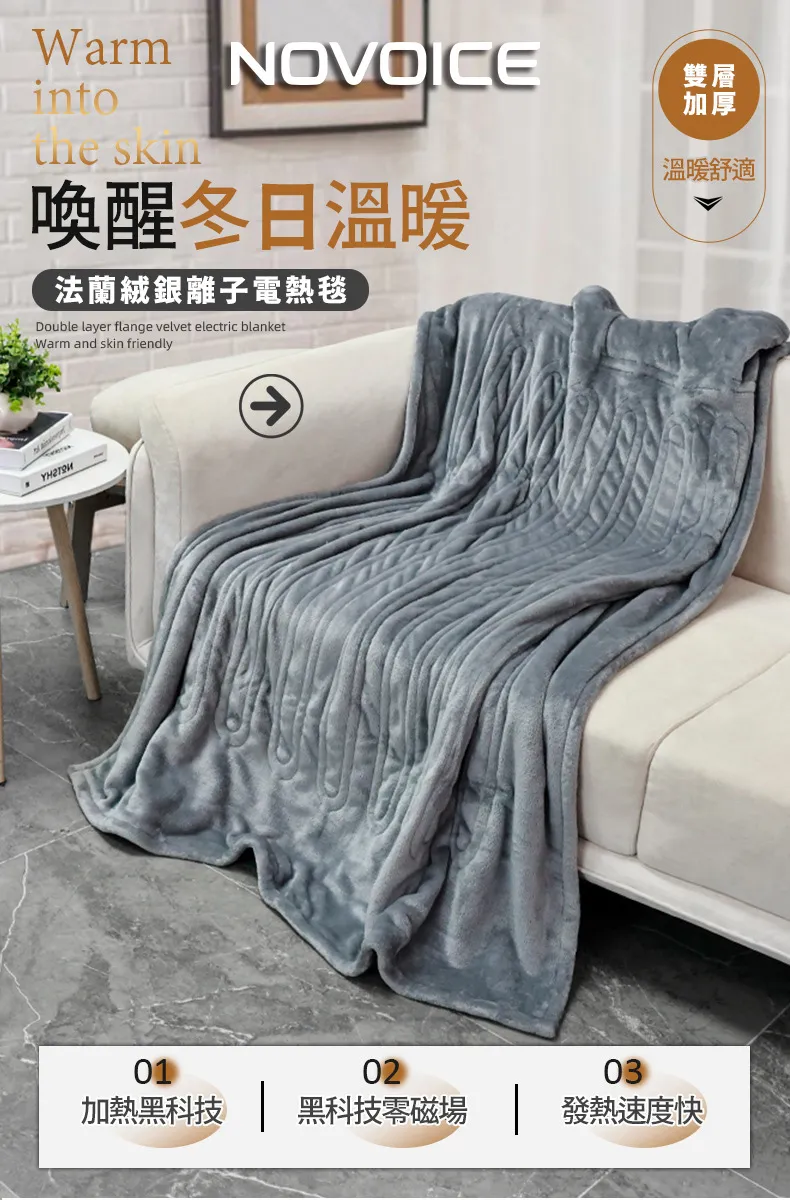 【NOVOICE 諾維斯】豪華法蘭絨銀離子雙人電熱毯NOV-H11 法蘭絨銀離子黑科技保暖舒適 30秒加熱有感,12小時定時功能 恆溫舒適,異常志騰斷電保護裝置