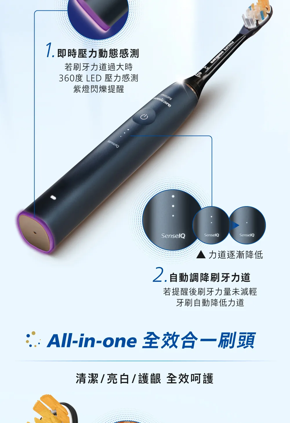 清潔、亮白、護齦 All-in-one刷頭 可離線使用APP、智能APP可調整刷柄模式 20倍有效清潔牙菌斑、15倍護齦力、2天有感亮白