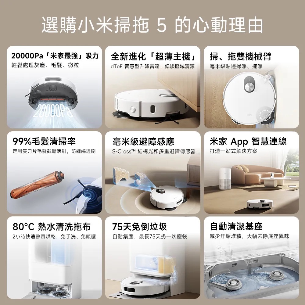 Xiaomi 小米掃拖機器人 5 (超薄88mm/升降dToF/20000Pa吸力/80度熱水洗/伸縮機械臂/掃地機器人)