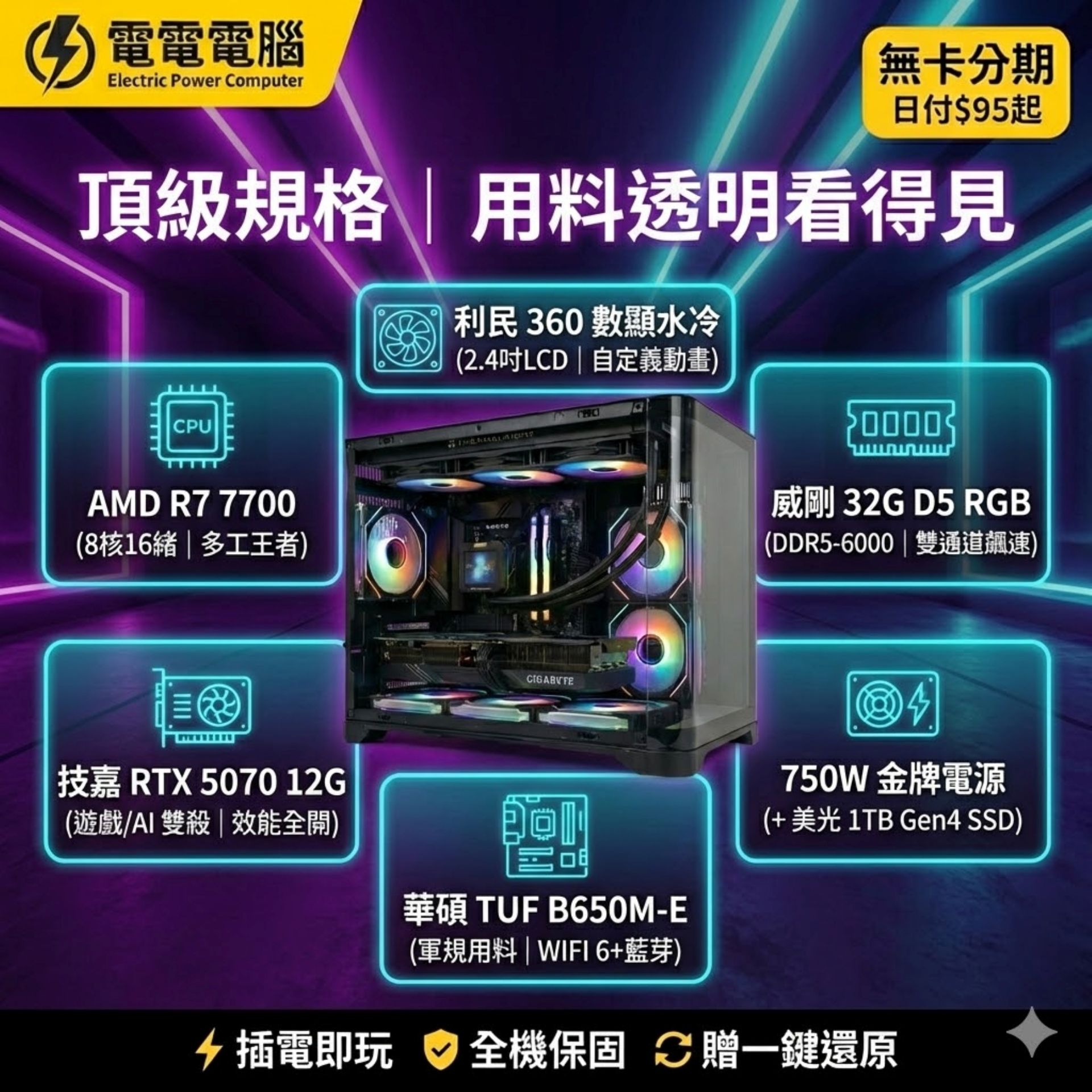 🔥 夢幻規格不用十萬!R7 7700 x RTX 5070 數顯水冷機,日付只要 $95 起