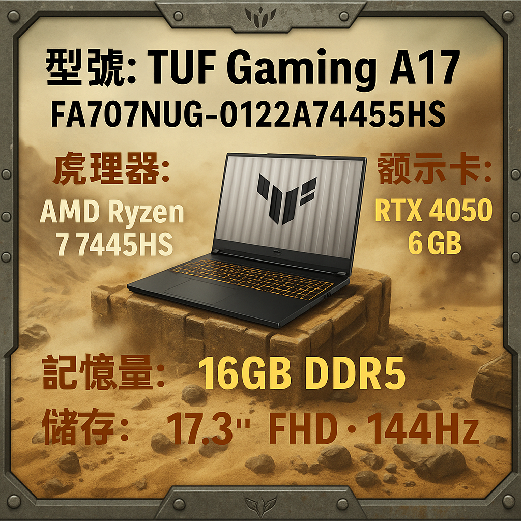 ⭐️ASUS TUF Gaming A17 FA707NUG-0122A7445HS御鐵灰 華碩薄邊框軍規電競筆電/R7-7445HS/RTX4050 6G/16GB DDR5/512G PCIe/17.3吋 FHD 144Hz/W11/含TUF電競滑鼠⭐️