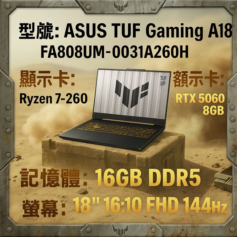 ⭐️ASUS TUF Gaming A18 FA808UM-0031A260H 御鐵灰 華碩薄邊框軍規電競AI筆電/Ryzen 7 260/RTX5060 8G/16GB DDR5/1TB PCIe/18吋 16:10 FHD+ 144Hz/W11/含TUF電競滑鼠⭐️