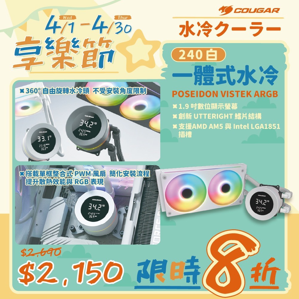 COUGAR 美洲獅POSEIDON VISTEK ARGB 240 一體式數位顯示 CPU水冷散熱器 白色