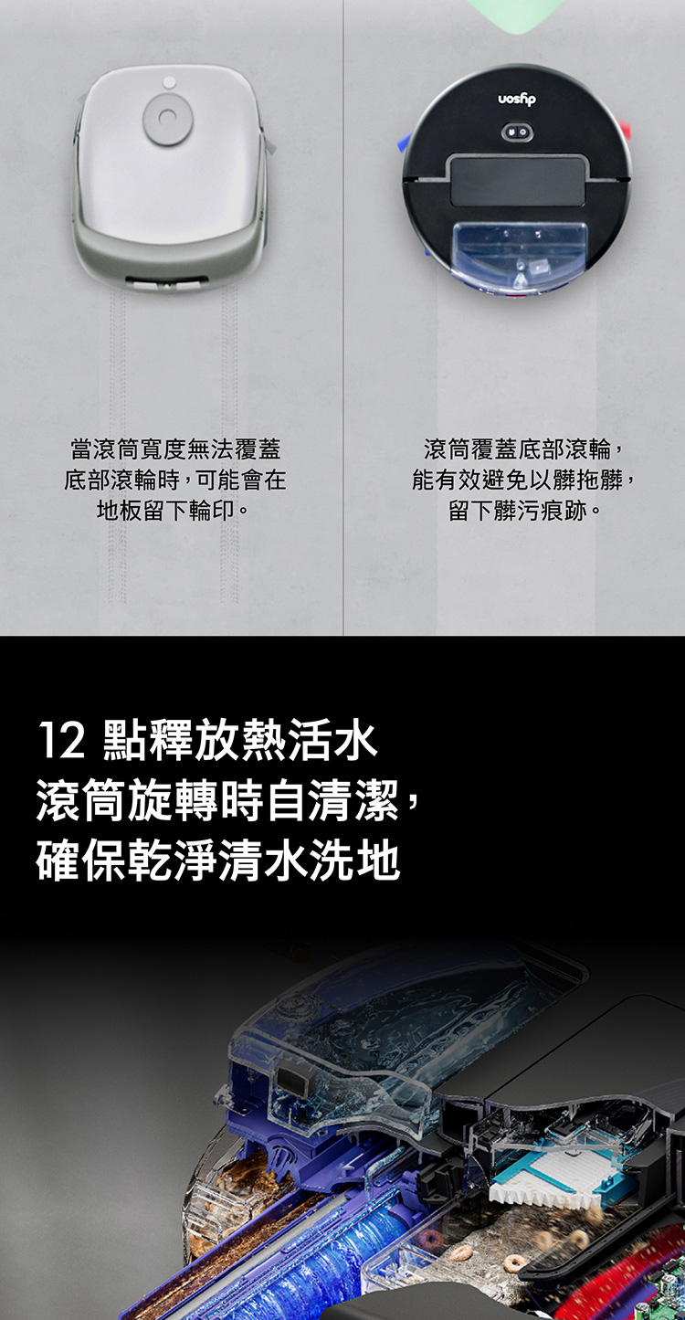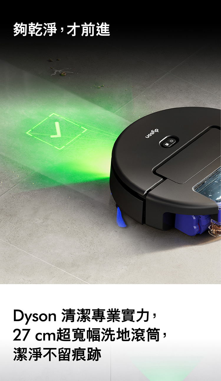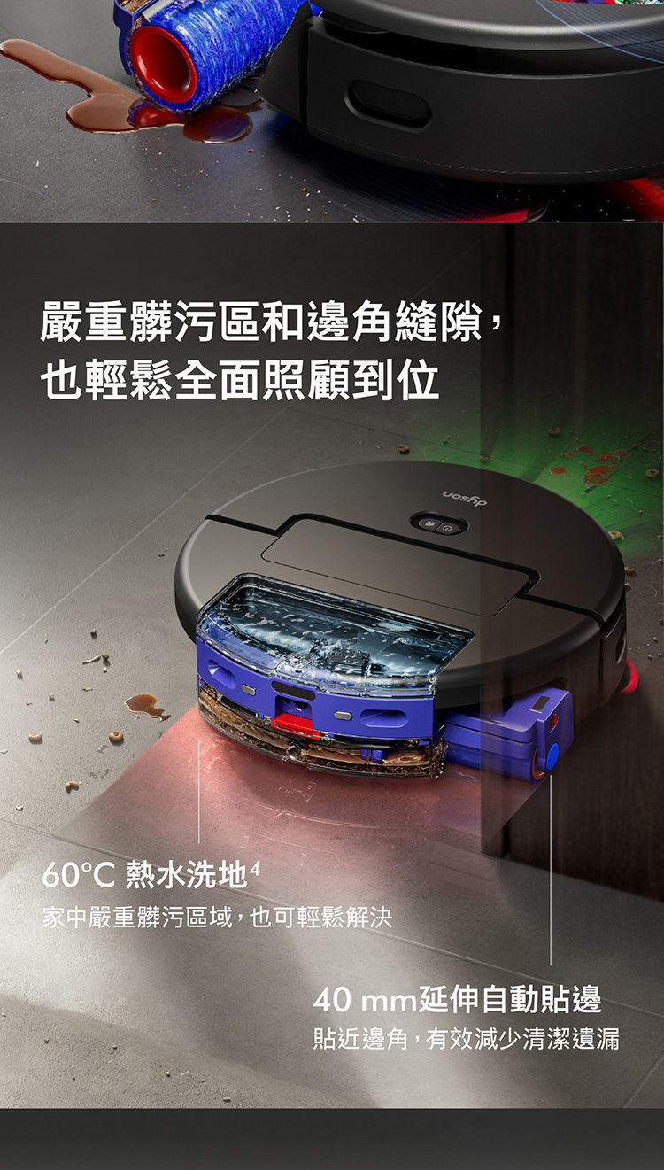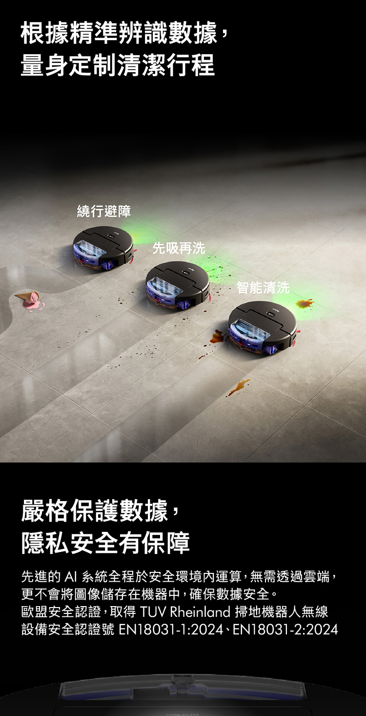 Ai偵測清潔,直到徹底潔淨,不乾淨不收工 Ai智慧感測系統,精準辨識近200種物品 27cm 超寬幅洗地滾筒,潔淨不留痕跡 12點釋放60°C熱活水洗地 避免毛髮纏繞與精準清潔 基座自清潔,助你解放雙手 嚴格保護數據,隱私安全有保障 於APP中快速建圖智能分區