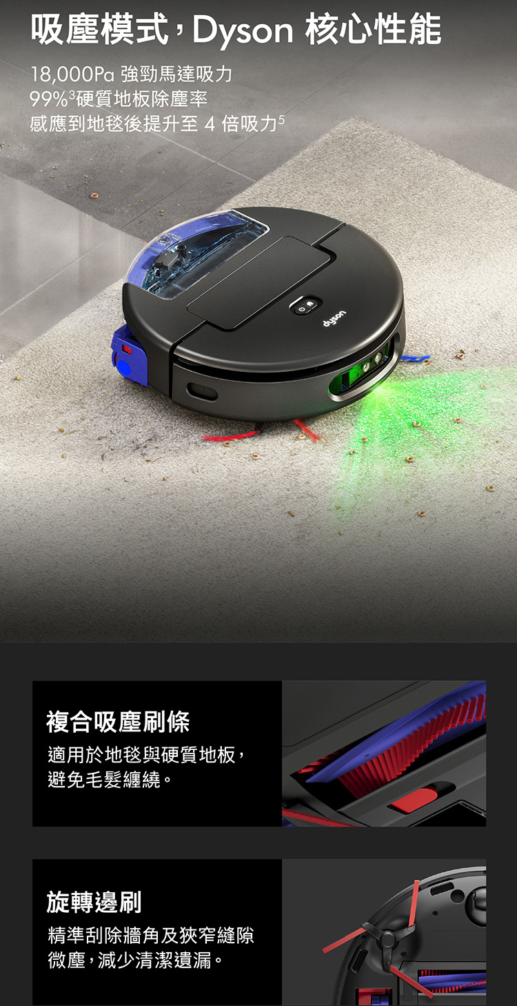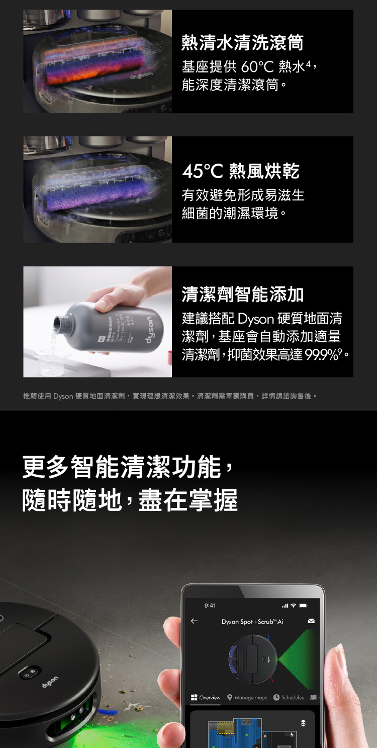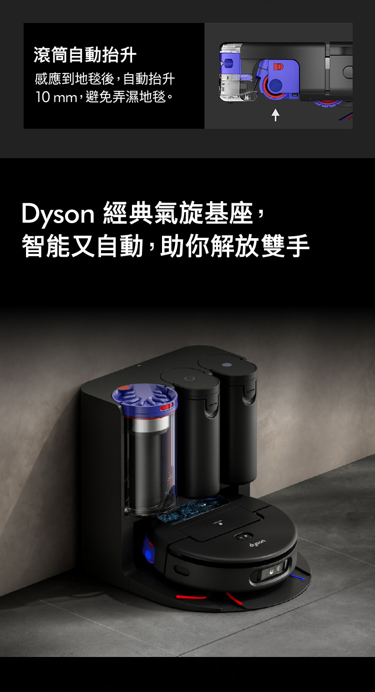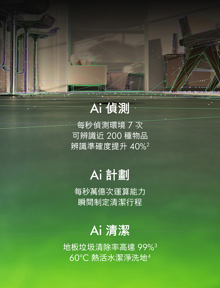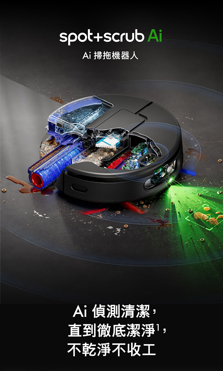 Ai偵測清潔,直到徹底潔淨,不乾淨不收工 Ai智慧感測系統,精準辨識近200種物品 27cm 超寬幅洗地滾筒,潔淨不留痕跡 12點釋放60°C熱活水洗地 避免毛髮纏繞與精準清潔 基座自清潔,助你解放雙手 嚴格保護數據,隱私安全有保障 於APP中快速建圖智能分區