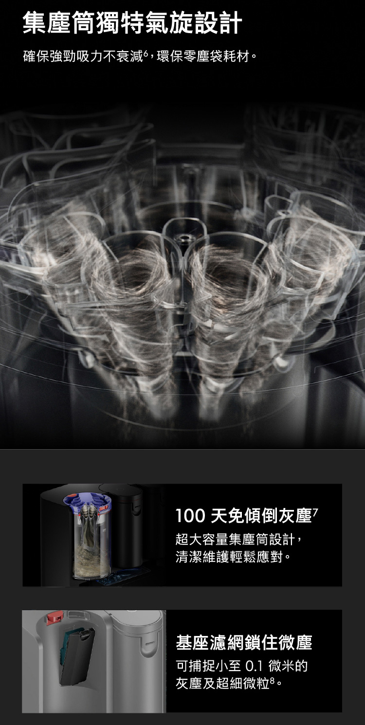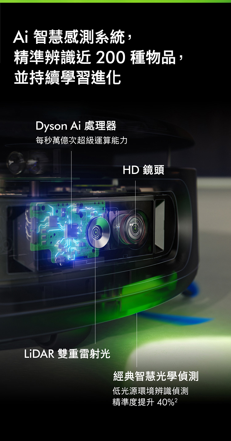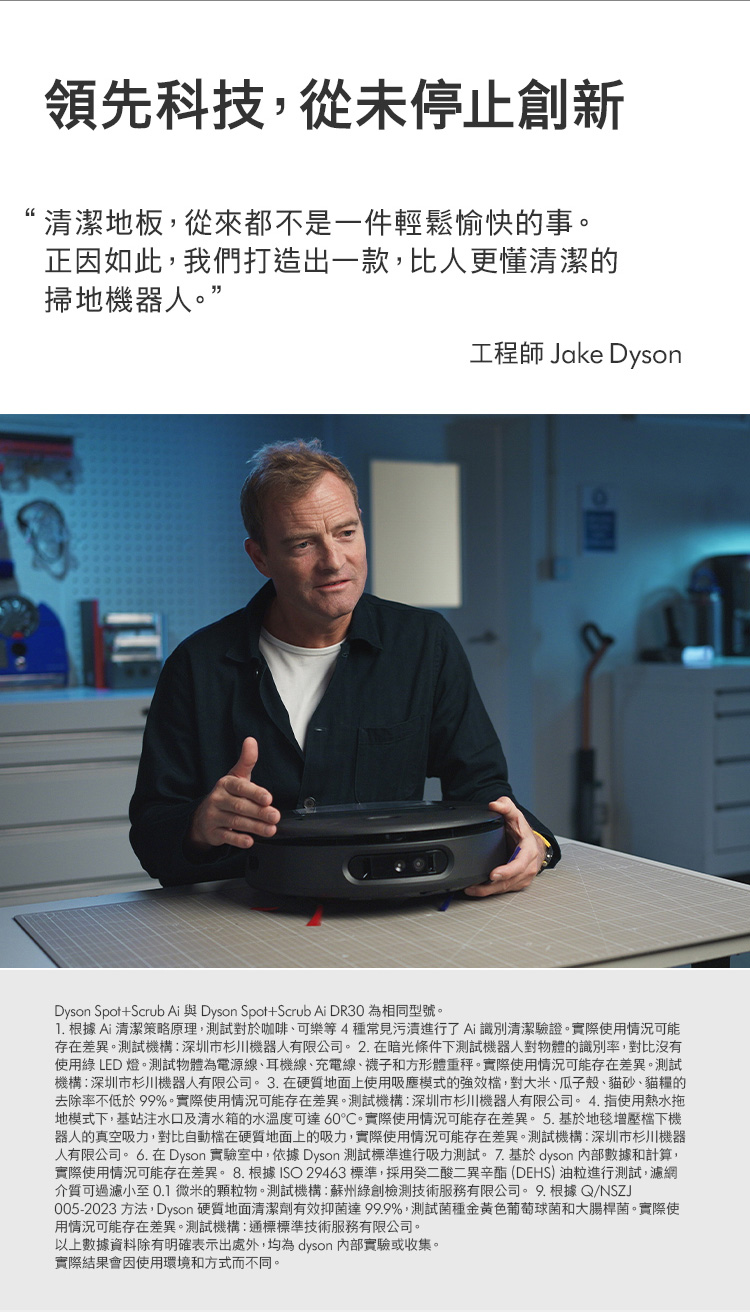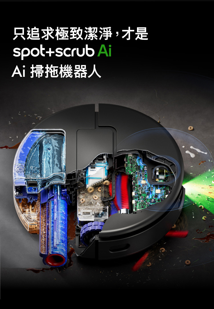 Ai偵測清潔,直到徹底潔淨,不乾淨不收工 Ai智慧感測系統,精準辨識近200種物品 27cm 超寬幅洗地滾筒,潔淨不留痕跡 12點釋放60°C熱活水洗地 避免毛髮纏繞與精準清潔 基座自清潔,助你解放雙手 嚴格保護數據,隱私安全有保障 於APP中快速建圖智能分區