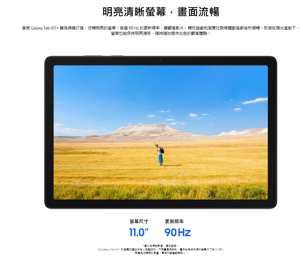 概覽 核心處理器時脈 2.5GHz, 2GHz 主相機解析度 800萬畫素 前置相機解析度 500萬畫素 重量 (g) 477 核心處理器 核心處理器時脈 2.5GHz, 2GHz 核心處理器類型 八核心處理器 顯示螢幕 主螢幕尺寸 278.2mm (11.0" 將螢幕四邊延伸為一完整矩形之測量結果) / 276.6mm (10.9" 考量圓角設計之測量結果) 主螢幕解析度 1920 x 1200 (WUXGA) 主螢幕技術 TFT 主螢幕色彩 16M 相機 主相機解析度 800萬畫素 主相機 - 自動對焦 有 前置相機解析度 500萬畫素 主相機閃光燈 無 儲存空間/記憶體 記憶體 (GB) 8GB 儲存空間 (GB) 256GB * 作業系統及預設應用程式將占用部分儲存空間,實際用戶可使用儲存空間將少於規格所標示的儲存空間容量。 * 作業系統或軟體版本的更新可能會導致用戶可使用儲存空間有所改變。 可用儲存空間* (GB) 233.2 支援外接儲存空間 最高支援至 2TB MicroSD 連結性 USB 版本 USB 2.0 定位系統 GPS, Glonass, Beidou, Galileo, QZSS 耳機孔 3.5mm Stereo MHL 否 Wi-Fi 802.11a/b/g/n/ac 2.4GHz+5GHz, VHT80 Wi-Fi Direct 有 藍牙版本 Bluetooth v5.3 NFC 無 藍牙規範 A2DP, AVRCP, DI, HFP, HID, HOGP, HSP, MAP, OPP, PAN, PBAP PC 同步應用程式 Smart Switch (PC 版) 作業系統 Android 感應器 加速度計, 陀螺儀, 數位指南針, 霍爾磁電感應器, 光感應器 實體規格 尺寸 (長x寬x高,mm) 168.7 x 257.1 x 6.9 重量 (g) 477 電池 電池容量 (實際電力表現依個人使用習慣有所差異) (mAh,典型值) 7040 影音 影片播放格式 MP4, M4V, 3GP, 3G2, AVI, FLV, MKV, WEBM 影片播放解析度 UHD 4K (3840 x 2160)@30fps 音樂播放格式 MP3, M4A, 3GA, AAC, OGG, OGA, WAV, AMR, AWB, FLAC, MID, MIDI, XMF, MXMF, IMY, RTTTL, RTX, OTA 服務與應用程式 支援 Gear Galaxy Buds Core, Galaxy Buds3 Pro, Galaxy Buds2 Pro, Galaxy Buds Pro, Galaxy Buds Live, Galaxy Buds+, Galaxy Buds3, Galaxy Buds2, Galaxy Buds, Galaxy Buds3 FE, Galaxy Buds FE 支援 SmartThings 有 軟體支援 安全性更新期間 (有效期限至) 2032年11月30日 * 作業系統及預設應用程式將占用部分儲存空間,實際用戶可使用儲存空間將少於規格所標示的儲存空間容量。作業系統或軟體版本的更新可能會導致用戶可使用儲存空間有所改變。