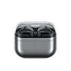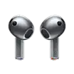 A pair of silver colored Galaxy Buds3 earbuds hover and circle around each other, then slowly slip into an open Galaxy Buds3 case.