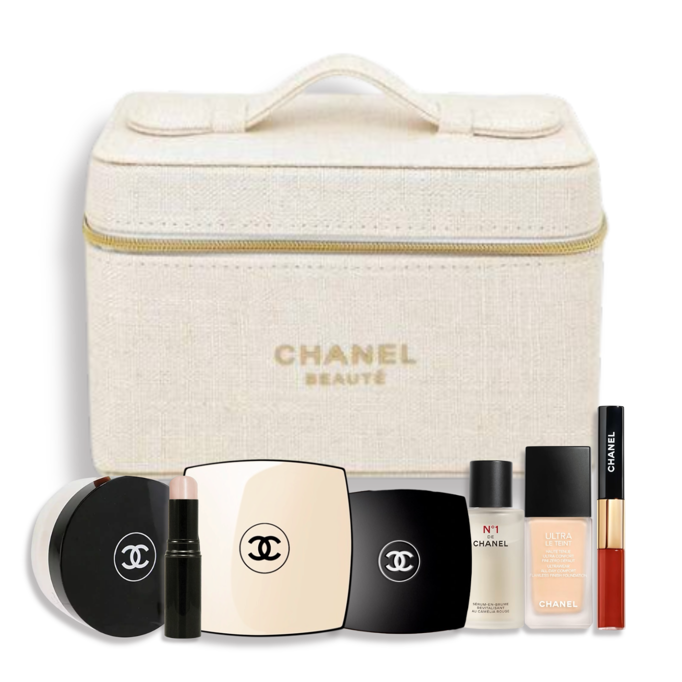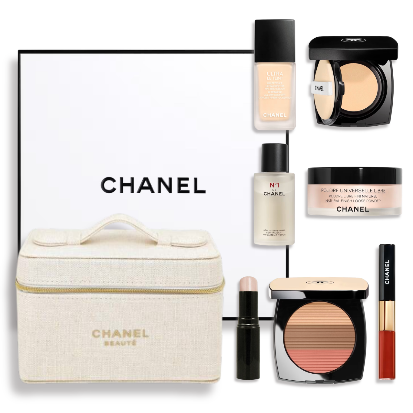 CHANEL 香奈兒美妝 雪紡持妝底妝禮盒附化妝包 BD01粉底/打亮/修容/唇釉 - 專櫃緞帶包裝