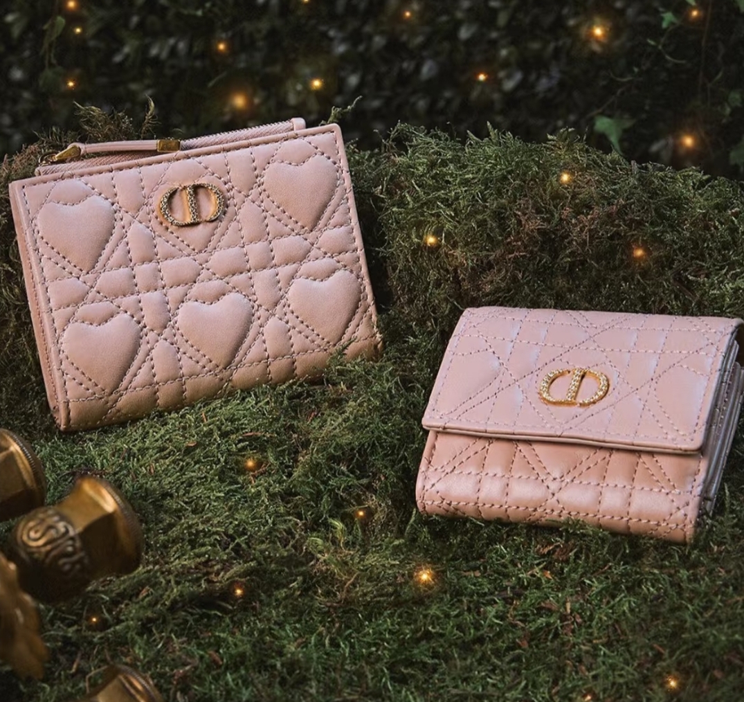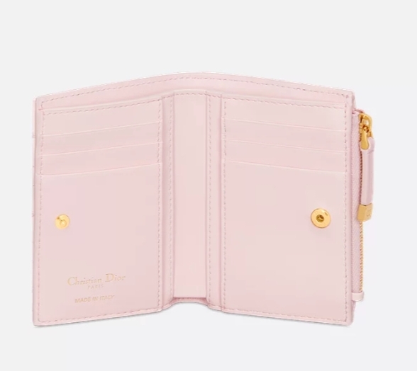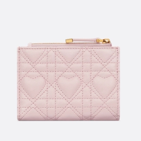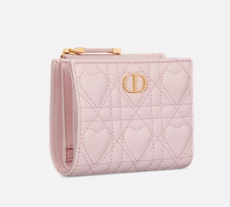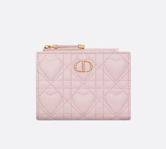 馬卡龍粉羊皮款式的 Dior Caro Dahlia 錢包搭配綴以愛心圖案的 Cannage 籐格紋縫線,正面飾有密鑲白色水晶的金色飾面金屬 CD 標誌,設計精巧別緻。款式時尚且收納空間寬敞,可與 Dior Caro 系列的包款相互搭配。