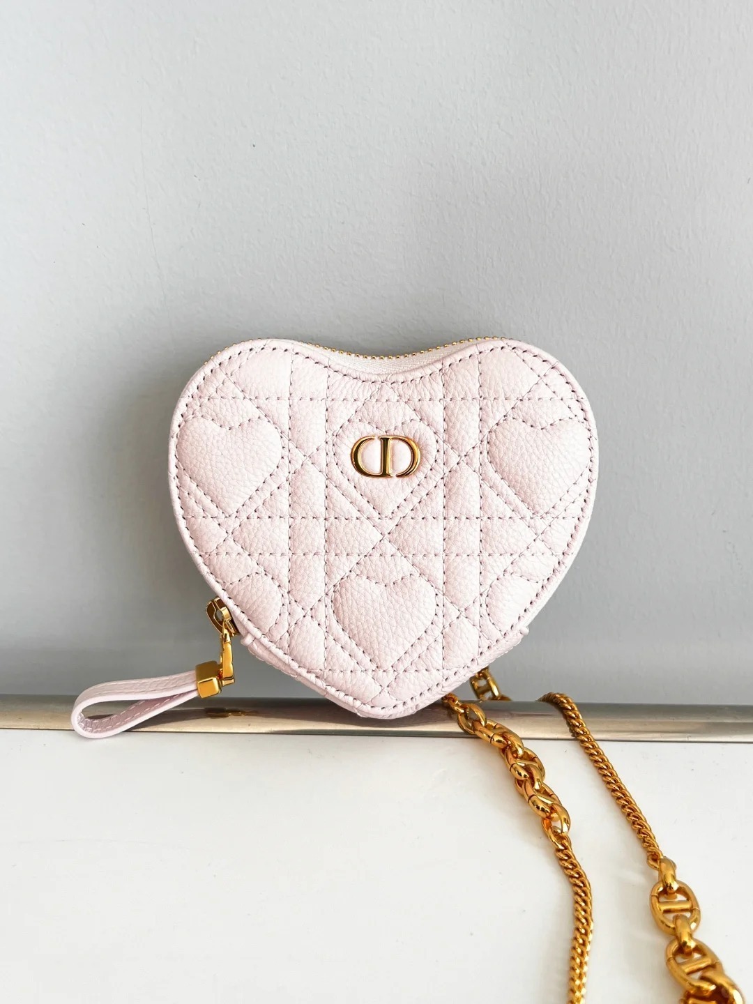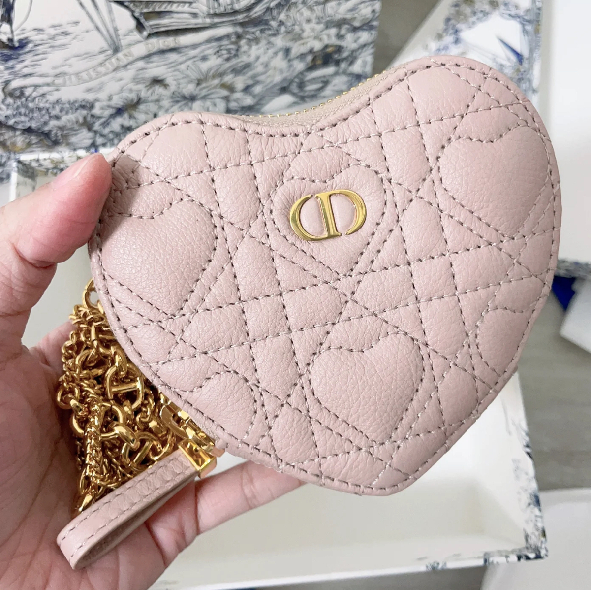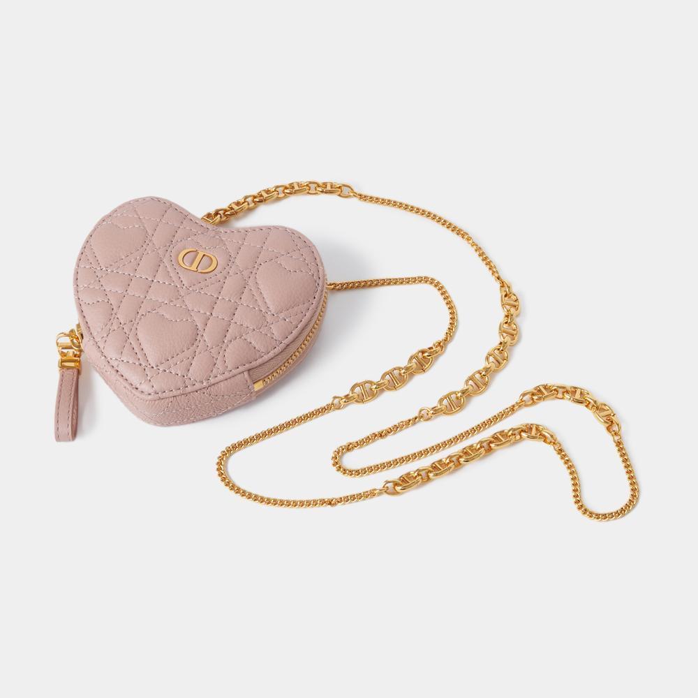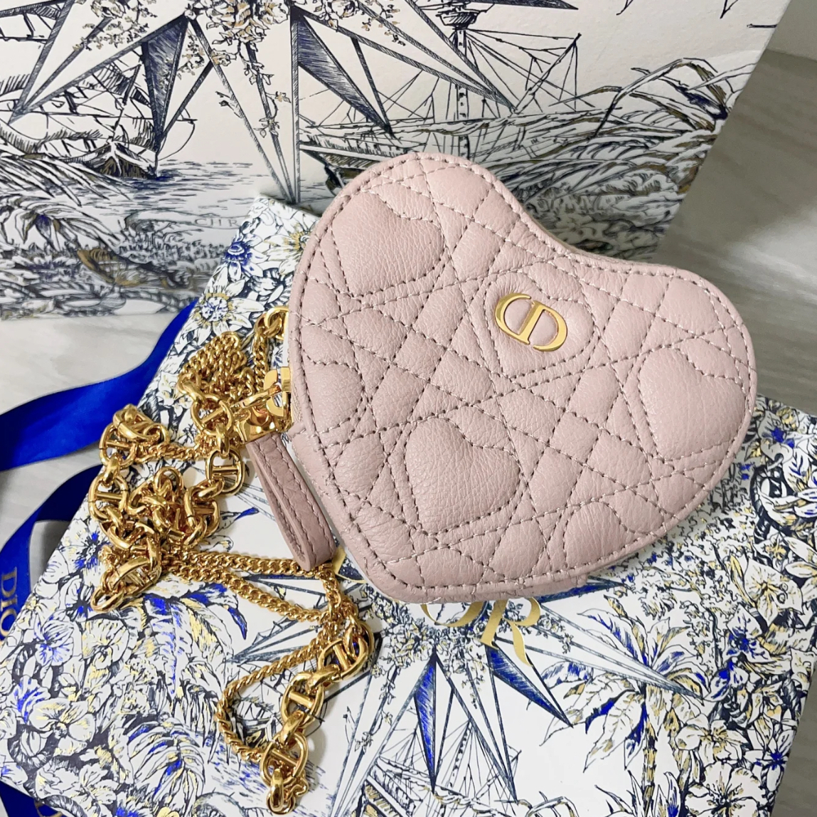 《現貨最低特價 》 Dior Dioramour Dior Caro Heart 附鏈帶手拿包 淡粉紅色 Cannage 籐格紋小牛皮搭配心形圖案