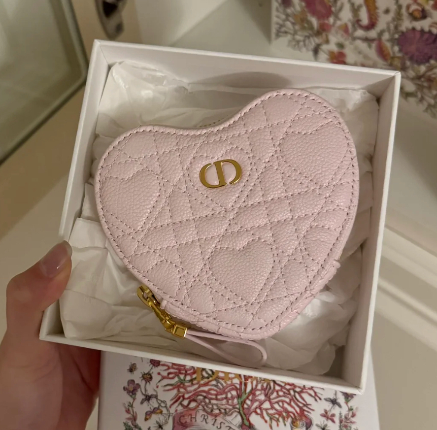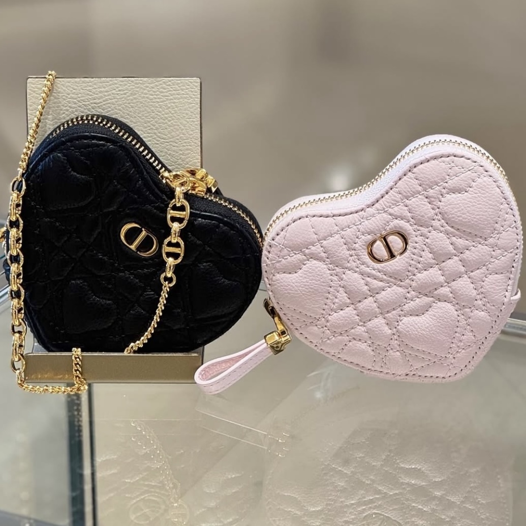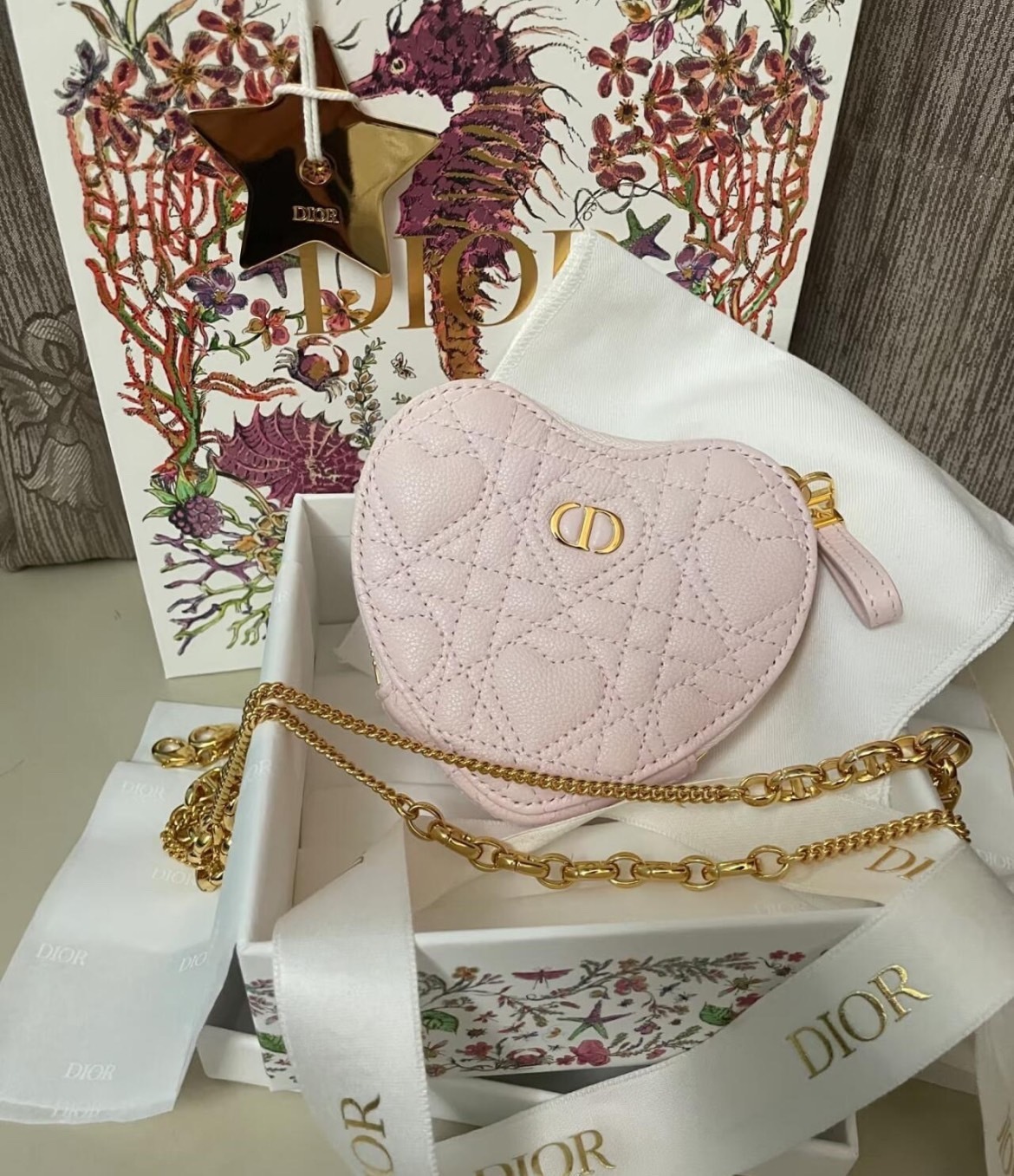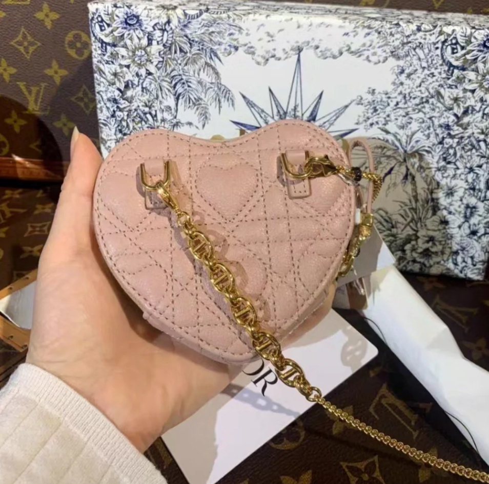 《現貨最低特價 》 Dior Dioramour Dior Caro Heart 附鏈帶手拿包 淡粉紅色 Cannage 籐格紋小牛皮搭配心形圖案