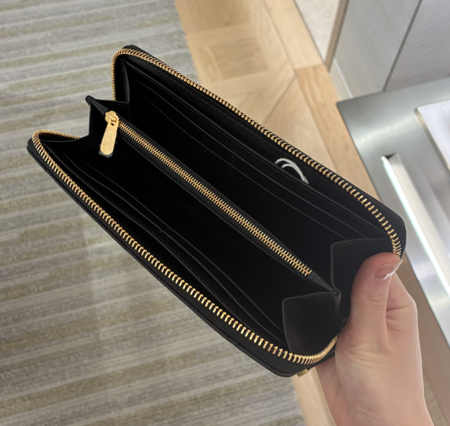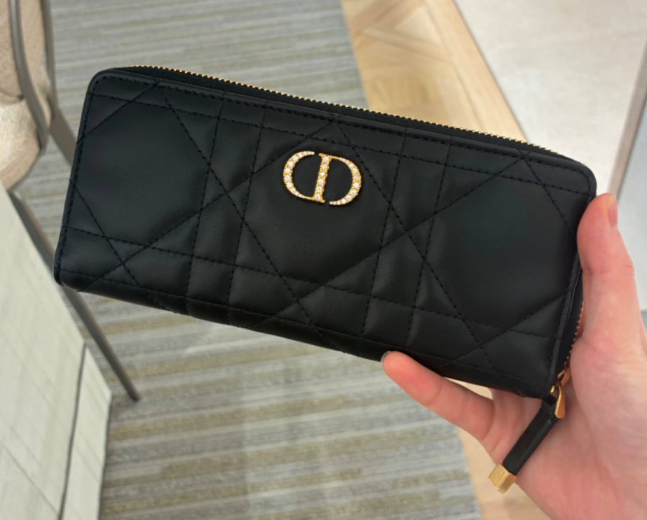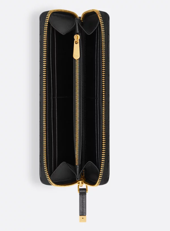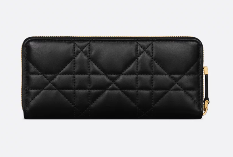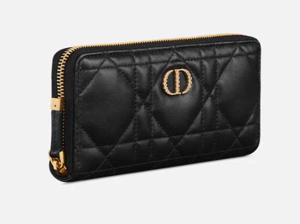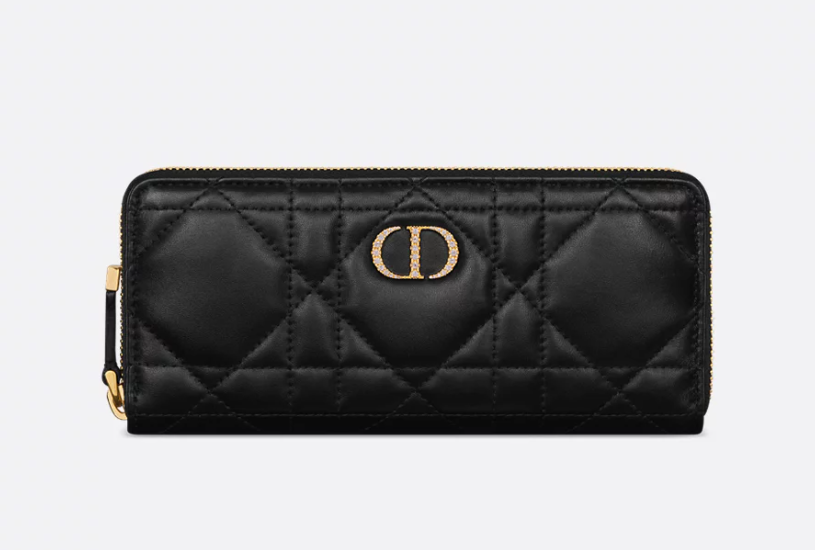 Miss Caro Voyageur 薄款錢包設計優雅實用,以黑色 Macrocannage 大籐格紋縫線羊皮製成,正面搭配綴以密鑲白色水晶的金色飾面金屬 CD 標誌,設計精巧別緻。時尚且收納空間寬敞,可收納所有日常必需品。這款錢包可搭配同系列其他配件,也可輕鬆放入任何包款中。