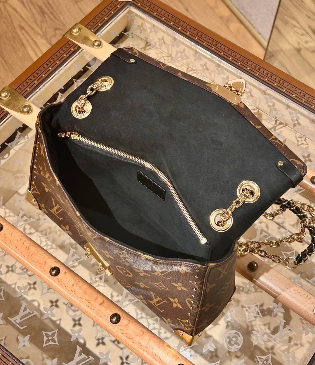 這款Trunkie包包的East West版本從原版設計汲取靈感,並呈現法棍包款式輪廓。包包以標誌性Monogram帆布製造,綴以多個精緻細節,包括皮革插鎖、金色護角、飾釘及經典S-lock鎖扣等,向品牌的旅遊傳統致敬。包款還配以滑動式鏈條,能輕鬆轉換不同的攜帶方式。