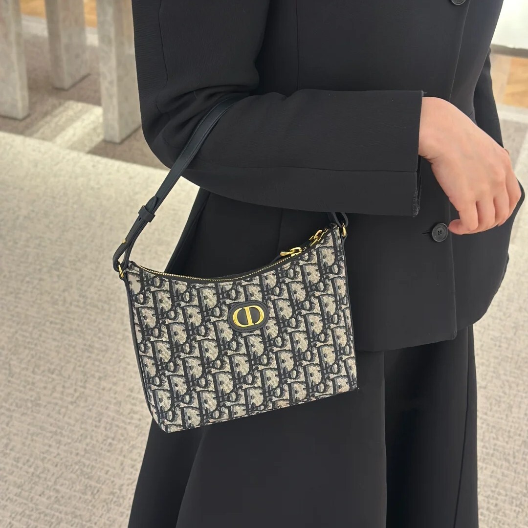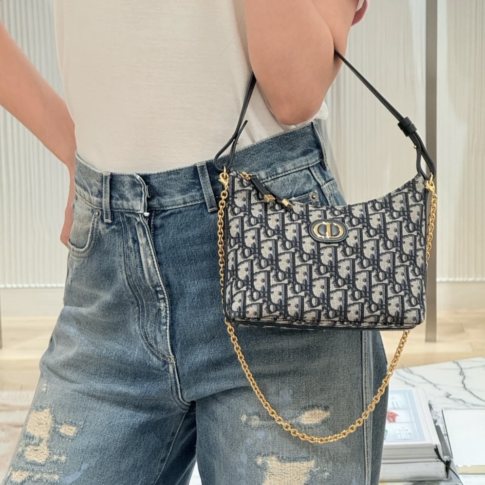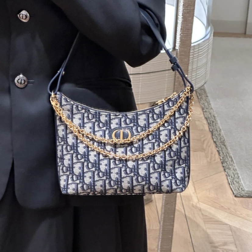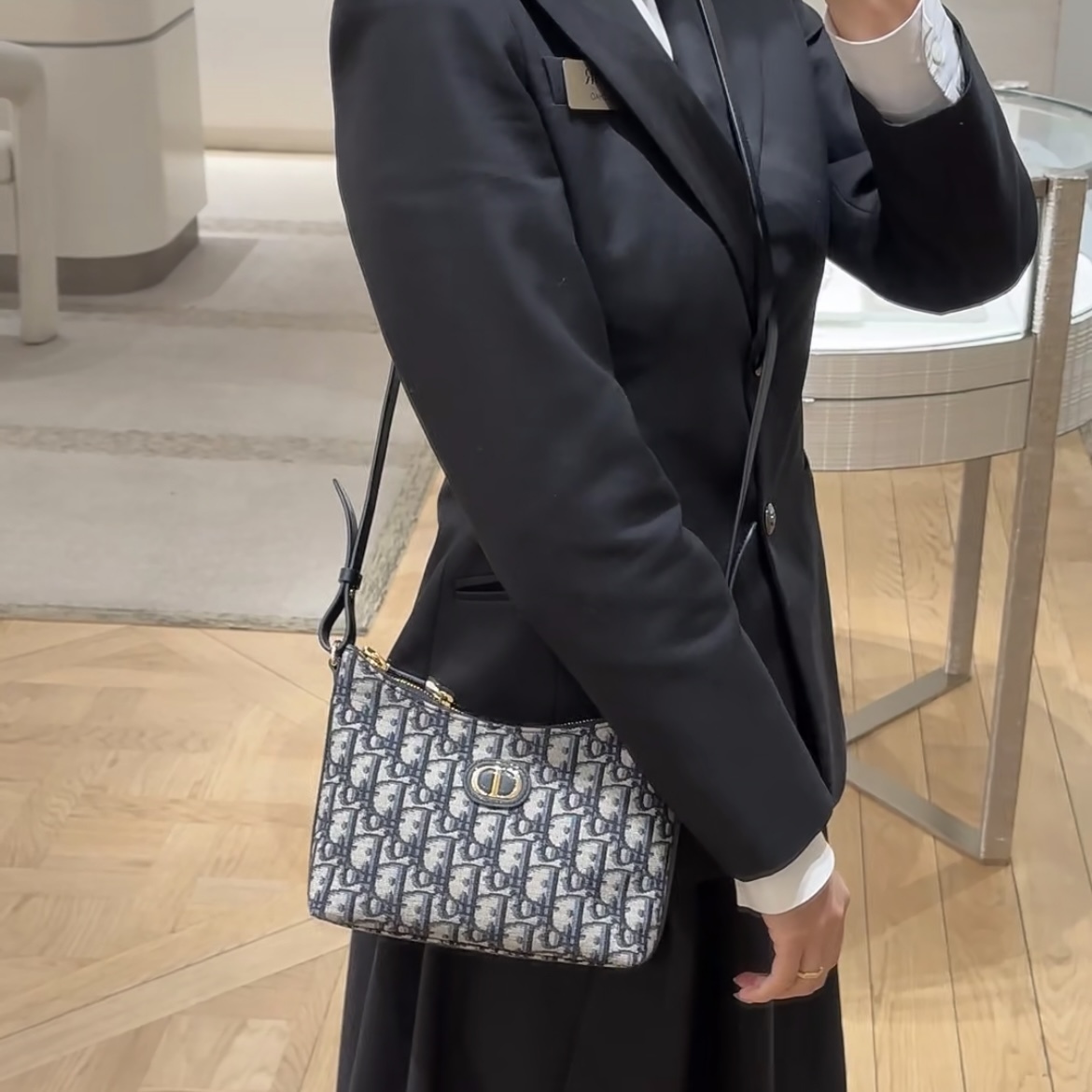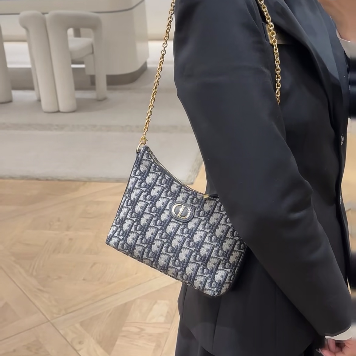 30 Montaigne Diorling 迷你包是 2025 冬季新品,設計時尚而實用,以藍色 Dior Oblique 緹花製成,搭配正面金色飾面金屬 CD 標誌,拉鍊隔層可收納所有必需品。包款搭配一條可拆卸可調式皮革背帶和頂部提把,另附有一條可拆卸鏈帶,方便肩背或斜背,日夜造型皆可搭配。