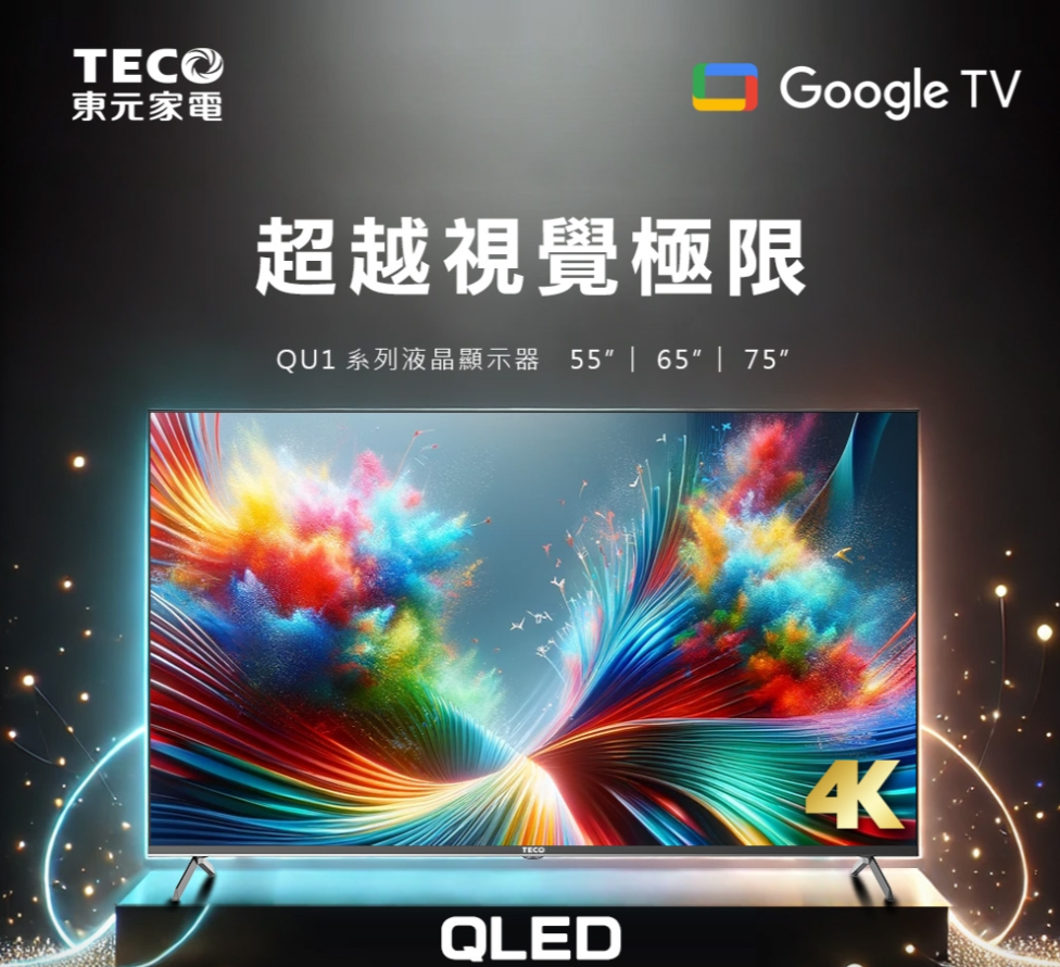 東元【TL65QU1TRE】65吋QLED 4K連網智慧顯示器 可視對角線(吋):65吋 聲音輸出功率L+R(w):10W+10W 解析度(H*V):4K(UHD) HDMI :4組 USB:2組 AV影音端子 1組 尺寸 (寬x高x深)寬1445.3X高831.5X深91.7 產地:中國 保固(年):三年 聯網功能:有 倍頻 144HZ 商品特色 4K UHD QLED Google TV 144Hz 高速演算刷新率 ALLM 自動低延遲模式 MEMC 動態補償