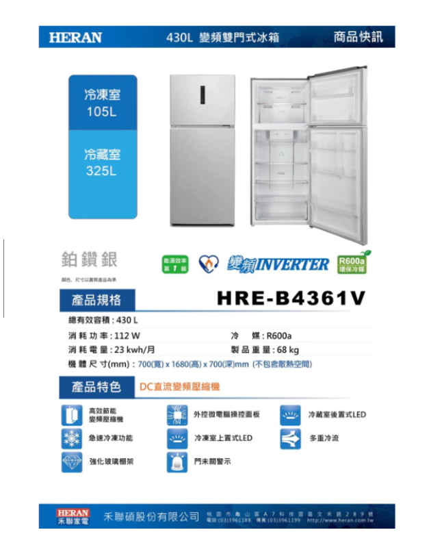 HRE-B4361V .有效內容積: 430公升 能源因數值: 22.3公升/度/月 產品效率分級: 第1級 .最低能源效率基準: 13.9 公升/度/月 .是否符合最低能源效率基準: .年耗電量: 276(度/年) 尺寸(mm): 寬700×高1685×深700 總有效內容積(L):430 等效內容積(L):511.9 能源因數值公升(度/月):21.2 節能標章基準:20.1 能源效率分級:1