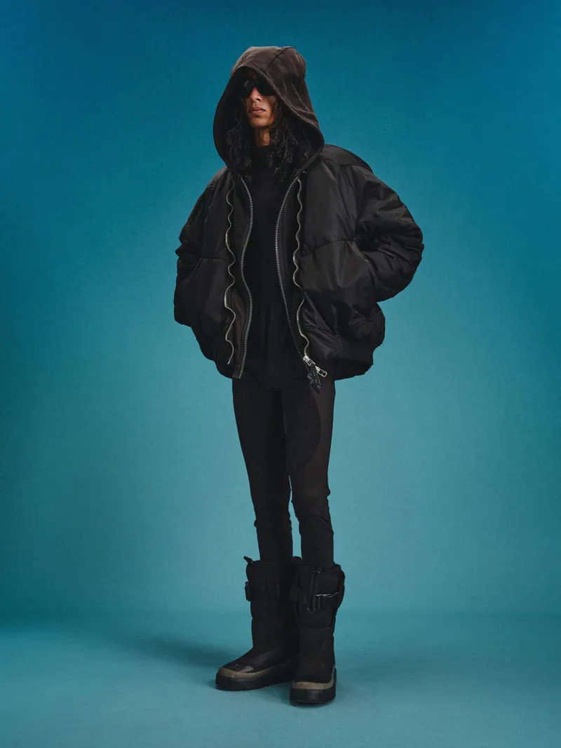 _雙層前襟:內層為堅固耐用的雙向拉鍊,外層為波浪形拉鍊,由巧妙的布料褶襉設計而成。